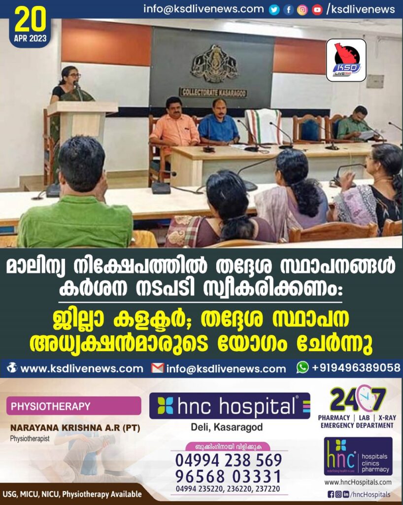 പഞ്ചായത്ത് തലത്തില് ജൈവ അജൈവ മാലിന്യ നിര്മാര്ജനം കാര്യക്ഷമമാക്കുന്നത് സംബന്ധിച്ച് യോഗത്തില് വിശദീകരണം നല്കി. ഹരിത കര്മ സേനയുടെ പ്രവര്ത്തനം ശക്തിപ്പെടുത്താനുള്ള നടപടികള് സ്വീകരിക്കും. ഗാര്ഹിക ജൈവ മാലിന്യ സംസ്കരണത്തെ കുറിച്ചറിയാന് ജനപ്രതിനിധികളുടെ വീ്്ട് സന്ദര്ശനം പൂര്ത്തിയാക്കാത്തവര് ഏപ്രില് 25നകം പൂര്ത്തിയാക്കാന് യോഗത്തില് നിര്ദേശം നല്കി. സന്ദര്ശനത്തില് ജൈവ മാലിന്യ സംസ്കരണ സംവിധാനമില്ലാത്ത വീടുകളുടെ കണക്കുകള് ശേഖരിക്കണം. വീടുകളില് ബയോ കമ്പോസ്റ്റ് അല്ലെങ്കില് ജൈവ മാലിന്യ സംസ്കരണ സംവിധാനങ്ങള് ഇല്ലെന്ന് ബോധ്യപ്പെട്ടാല് ഇത്തരം സംവിധാനങ്ങള് ഒരുക്കി നല്കാന് തദ്ദേശ സ്ഥാപനങ്ങള് നടപടി സ്വീകരിക്കണം. ഹരിതകര്മ സേനകളുടെ പ്രവര്ത്തനം മെച്ചപ്പെടുത്തേണ്ട തദ്ദേശ സ്ഥാപനങ്ങളില് പ്രത്യേകം യോഗം വിളിക്കും. ഓരോ പഞ്ചായത്തുകളിലുമുള്ള മാലിന്യ കൂമ്പാരങ്ങളുടെ കണക്ക് ഉടന് നല്കണമെന്ന് യോഗത്തില് അറിയിച്ചു. അജൈവ മാലിന്യ നിര്മാര്ജനവുമായി ബന്ധപ്പെട്ട് ജില്ലയിലെ വ്യാപാരികളുടെ യോഗം വിളിച്ച് ചേര്ക്കും.