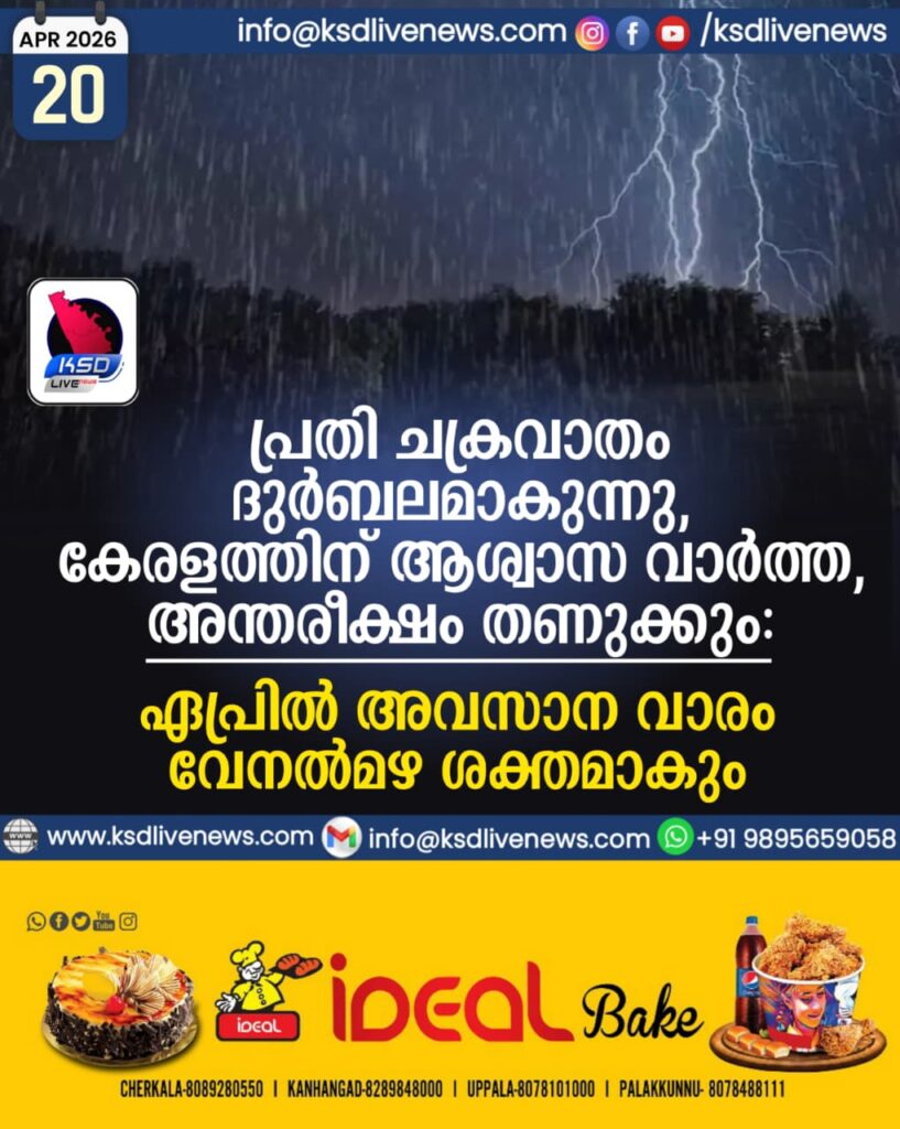 പ്രതി ചക്രവാതം ദുര്ബലമാകുന്നു, കേരളത്തിന് ആശ്വാസ വാര്ത്ത, അന്തരീക്ഷം തണുക്കും; ഏപ്രില് അവസാന വാരം വേനല്മഴ ശക്തമാകും