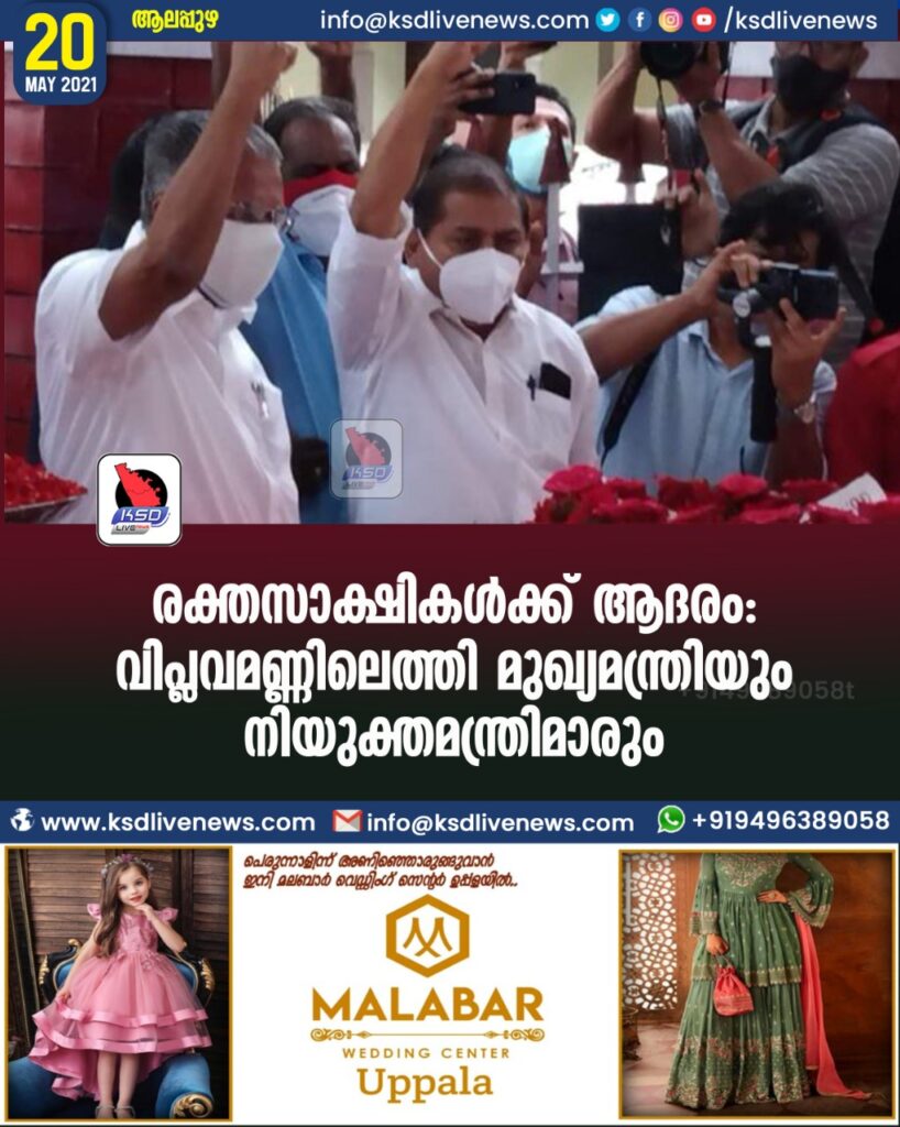 ആ​ല​പ്പു​ഴ: ര​ണ്ടാം പി​ണ​റാ​യി സ​ർ​ക്കാ​രി​ന്‍റെ സ​ത്യ​പ്ര​തി​ജ്ഞ​ക്ക് മു​ന്നോ​ടി​യാ​യി മു​ഖ്യ​മ​ന്ത്രി​യും സി​പി​എം, സി​പി​ഐ മ​ന്ത്രി​മാ​രും ആ​ല​പ്പു​ഴ​യി​ലെ​ത്തി ര​ക്ത​സാ​ക്ഷി​ക​ൾ​ക്ക് ആ​ദ​ര​മ​ർ​പ്പി​ച്ചു. ആ​ദ്യം വ​യ​ലാ​റി​ലെ ര​ക്ത​സാ​ക്ഷി മ​ണ്ഡ​പ​ത്തി​ല്‍ പു​ഷ്പാ​ര്‍​ച്ച​ന ന​ട​ത്തി​യ ശേ​ഷം വ​ലി​യ ചു​ടു​കാ​ട്ടി​ലും ആ​ദ​രം അ​ർ​പ്പി​ച്ചു.