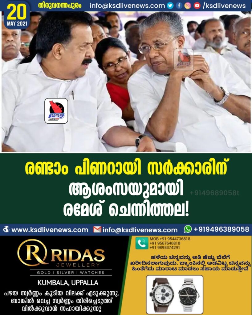 രണ്ടാം പിണറായി സർക്കാരിന് ആശംസയുമായി രമേശ് ചെന്നിത്തല‍