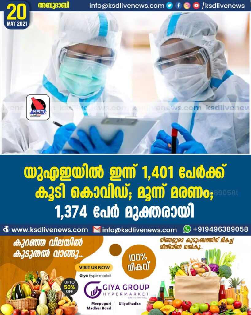 യുഎഇയില്‍ ഇന്ന് 1,401 പേര്‍ക്ക് കൂടി കൊവിഡ് ; മൂന്ന് മരണം; 1,374 പേർ മുക്തരായി