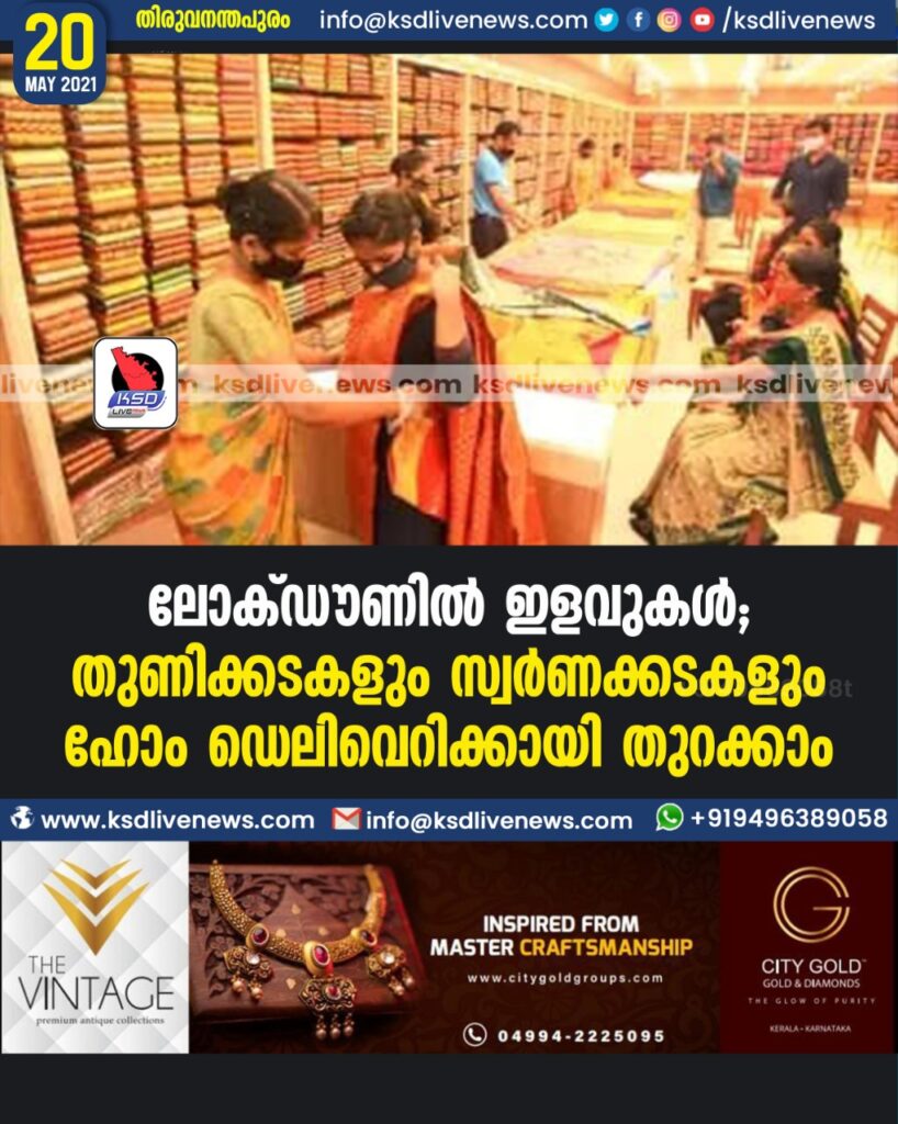 ലോക്ഡൗണില് ഇളവുകള്: തുണിക്കടകളും സ്വർണക്കടകളും ഹോം ഡെലിവെറിക്കായി തുറക്കാം