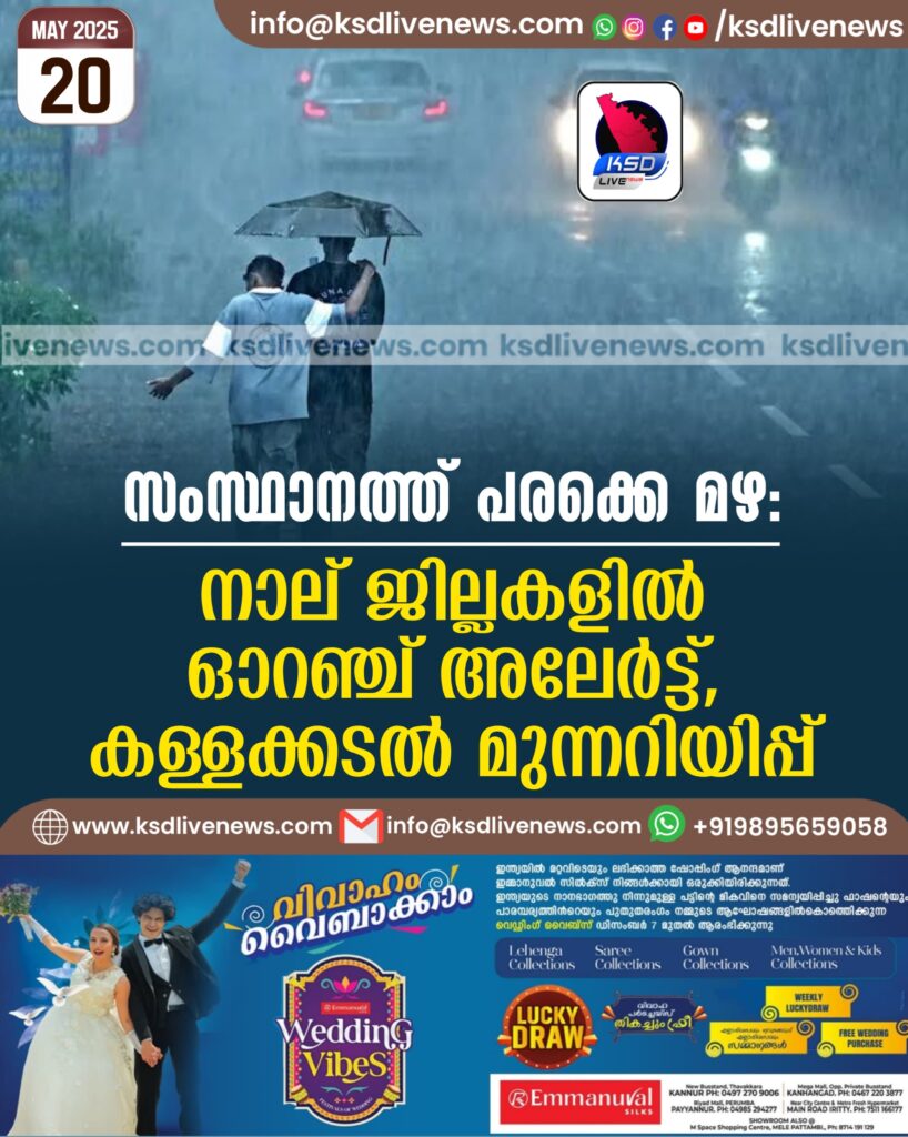 സംസ്ഥാനത്ത് പരക്കെ മഴ: നാല് ജില്ലകളിൽ ഓറഞ്ച് അലേർട്ട്, കള്ളക്കടൽ മുന്നറിയിപ്പ്