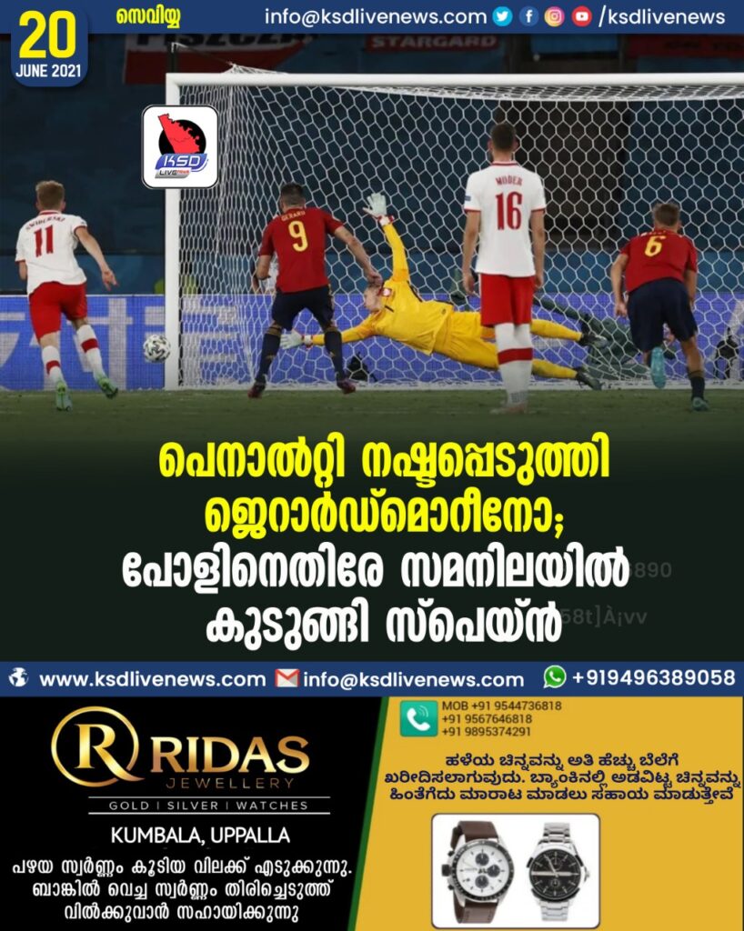പെനാല്റ്റി നഷ്ടപ്പെടുത്തി ജെറാര്ഡ് മൊറീനോ; പോളണ്ടിനെതിരേ സമനിലയില് കുടുങ്ങി സ്പെയ്ന്