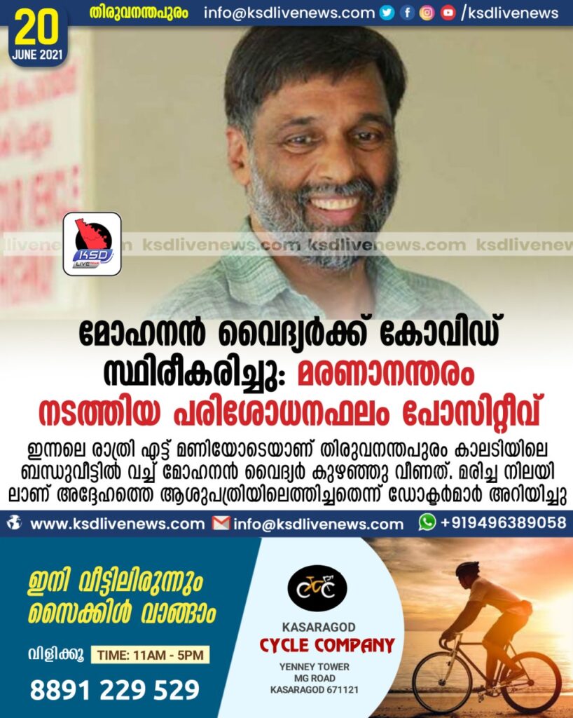 മോഹനൻ വൈദ്യർക്ക് കൊവിഡ് സ്ഥിരീകരിച്ചു: മരണാനന്തരം നടത്തിയ പരിശോധനഫലം പോസിറ്റീവ്