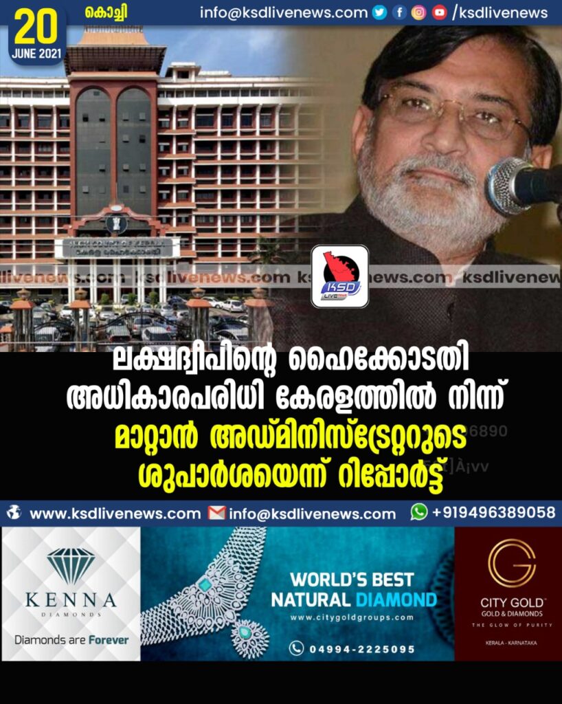 ലക്ഷദ്വീപിന്റെ ഹൈക്കോടതി അധികാരപരിധി കേരളത്തില് നിന്ന് മാറ്റാന് അഡ്മിനിസ്ട്രേറ്ററുടെ ശുപാര്ശയെന്ന് റിപ്പോര്ട്ട്