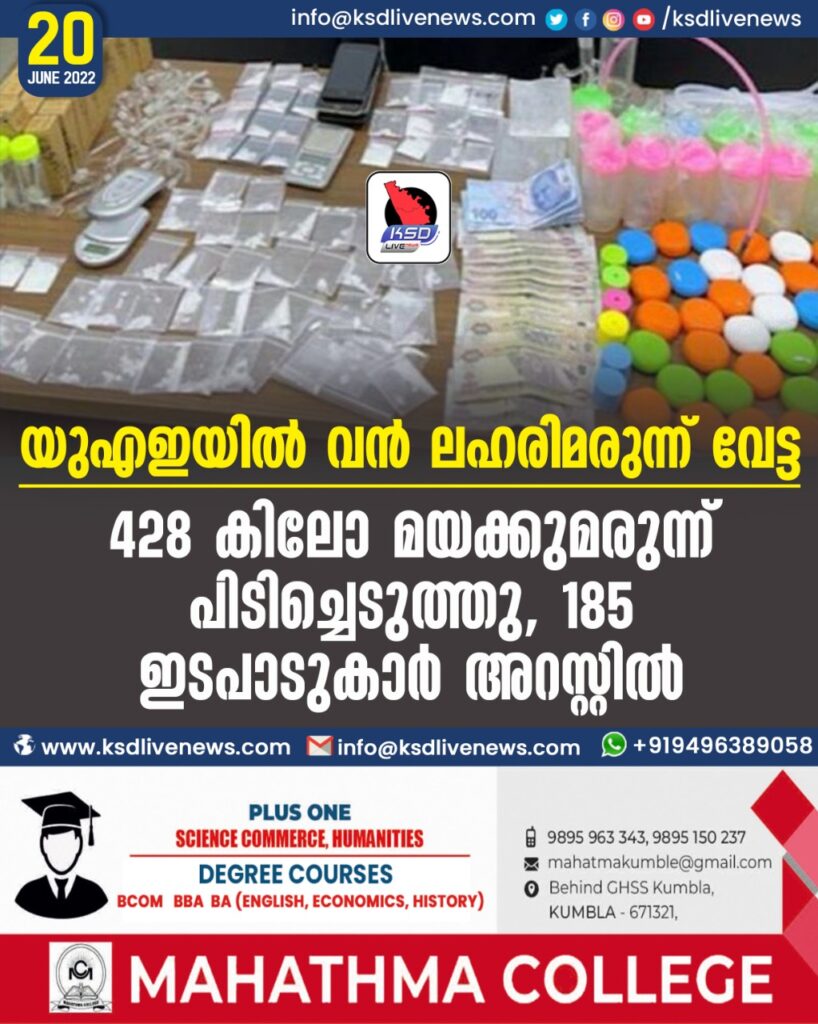 യുഎഇയില് വന് ലഹരിമരുന്ന് വേട്ട; 428 കിലോ മയക്കുമരുന്ന് പിടിച്ചെടുത്തു, 185 ഇടപാടുകാര് അറസ്റ്റില്