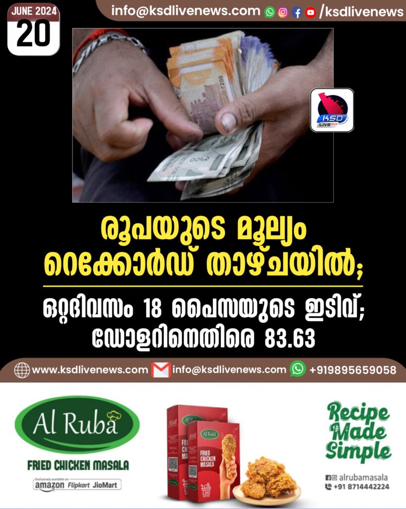 രൂപയുടെ മൂല്യം റെക്കോര്ഡ് താഴ്ചയില്, ഒറ്റദിവസം 18 പൈസയുടെ ഇടിവ്; ഡോളറിനെതിരെ 83.63