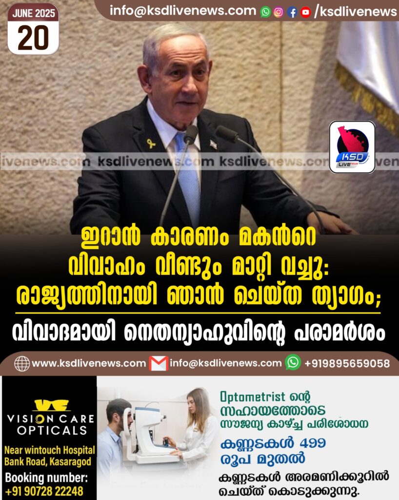 ഇറാന് കാരണം മകന്റെ വിവാഹം വീണ്ടും മാറ്റി വച്ചു: രാജ്യത്തിനായി ഞാന് ചെയ്ത ത്യാഗം; വിവാദമായി നെതന്യാഹുവിന്റെ പരാമർശം