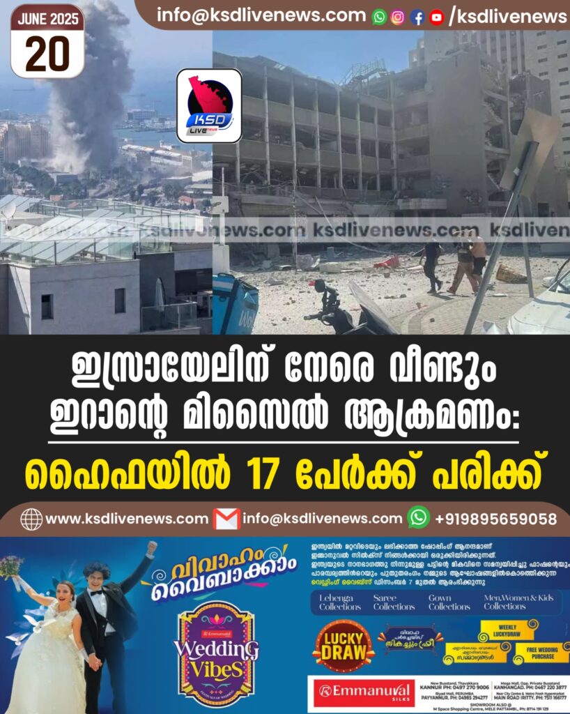 ഇസ്രായേലിന് നേരെ വീണ്ടും ഇറാന്റെ മിസൈൽ ആക്രമണം; ഹൈഫയിൽ 17 പേർക്ക് പരിക്ക്