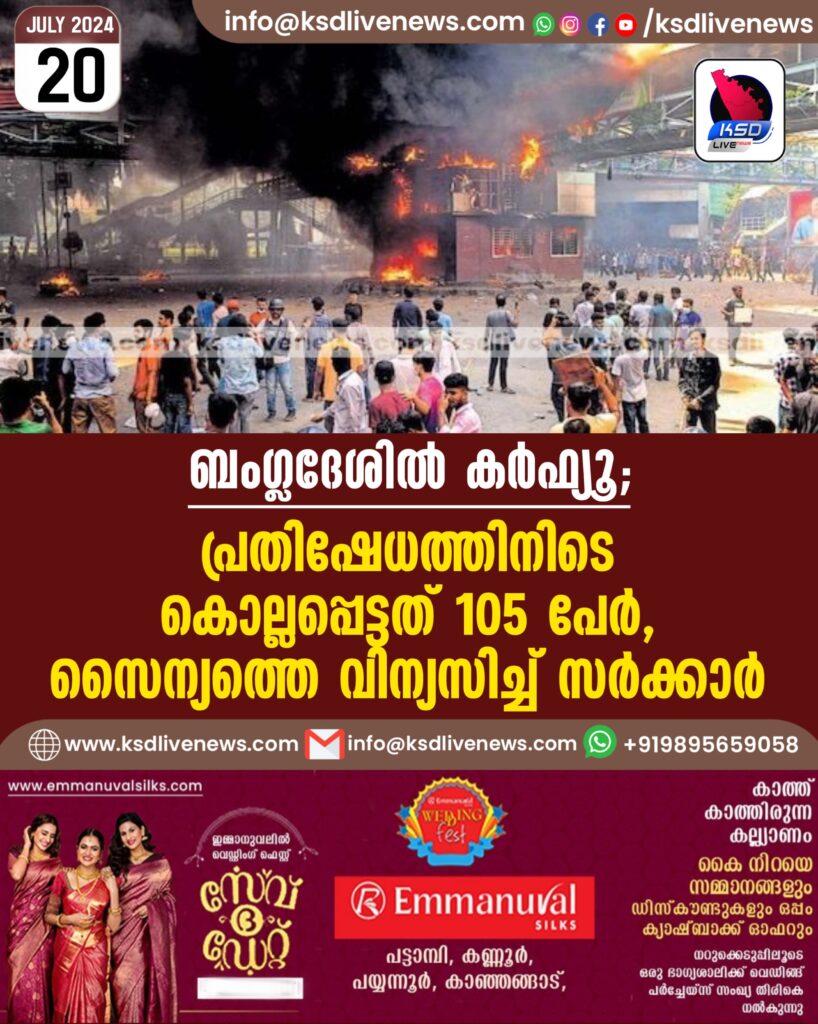 ബംഗ്ലദേശിൽ കർഫ്യൂ; പ്രതിഷേധത്തിനിടെ കൊല്ലപ്പെട്ടത് 105 പേർ, സൈന്യത്തെ വിന്യസിച്ച് സർക്കാർ