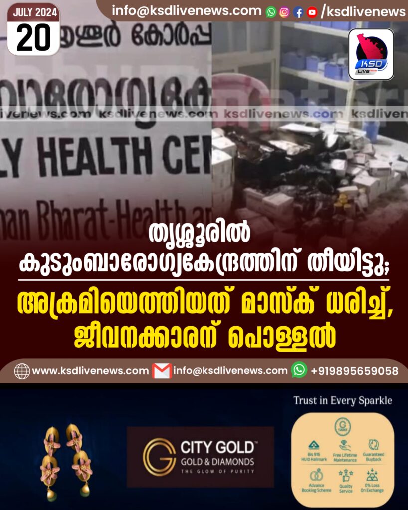 തൃശ്ശൂരില് കുടുംബാരോഗ്യകേന്ദ്രത്തിന് തീയിട്ടു; അക്രമിയെത്തിയത് മാസ്ക് ധരിച്ച്, ജീവനക്കാരന് പൊള്ളൽ