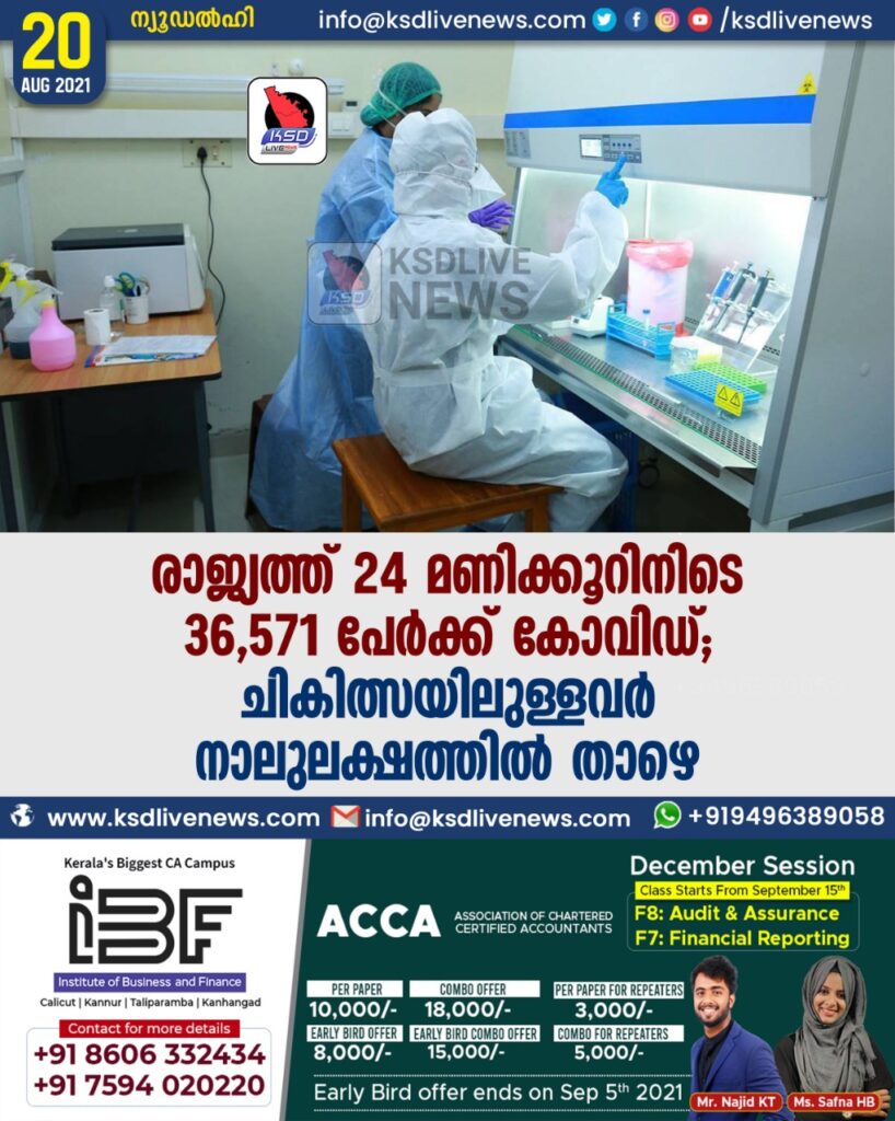രാജ്യത്ത് 24 മണിക്കൂറിനിടെ 36,571 പേർക്ക് കോവിഡ്; ചികിത്സയിലുള്ളവർ നാലുലക്ഷത്തിൽ താഴെ