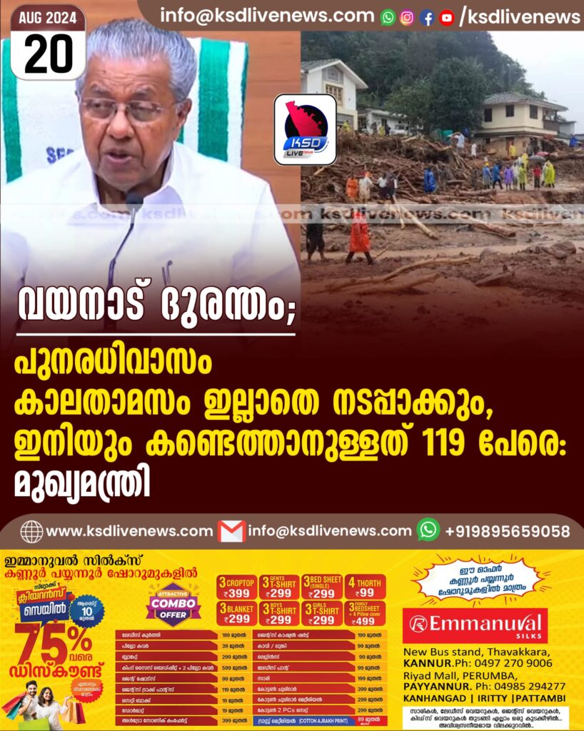 വയനാട് ദുരന്തം; പുനരധിവാസം കാലതാമസം ഇല്ലാതെ നടപ്പാക്കും, ഇനിയും കണ്ടെത്താനുള്ളത് 119 പേരെ: മുഖ്യമന്ത്രി