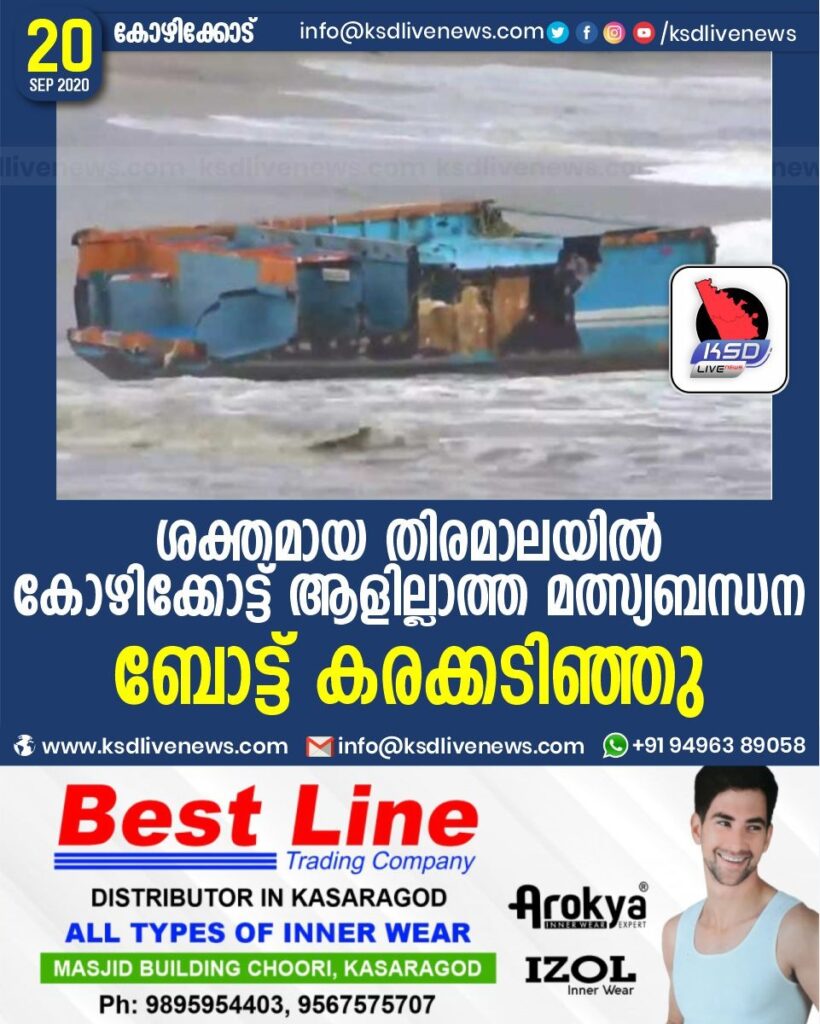 ശക്തമായ തിരമാലയില് കോഴിക്കോട്ട് ആളില്ലാത്ത മത്സ്യബന്ധന ബോട്ട് കരക്കടിഞ്ഞു