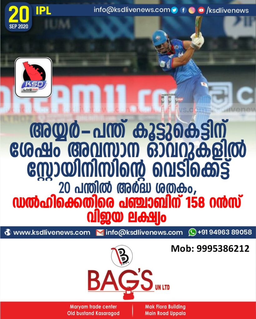 അയ്യര്‍-പന്ത് കൂട്ടുകെട്ടിന് ശേഷം അവസാന ഓവറുകളില്‍ സ്റ്റോയിനിസിന്റെ വെടിക്കെട്ട്, 20 പന്തില്‍ അര്‍ദ്ധ ശതകം ; ഡൽഹിക്കെതിരെ പഞ്ചാബിന് 158 റൻസ് വിജയ ലക്ഷ്യം