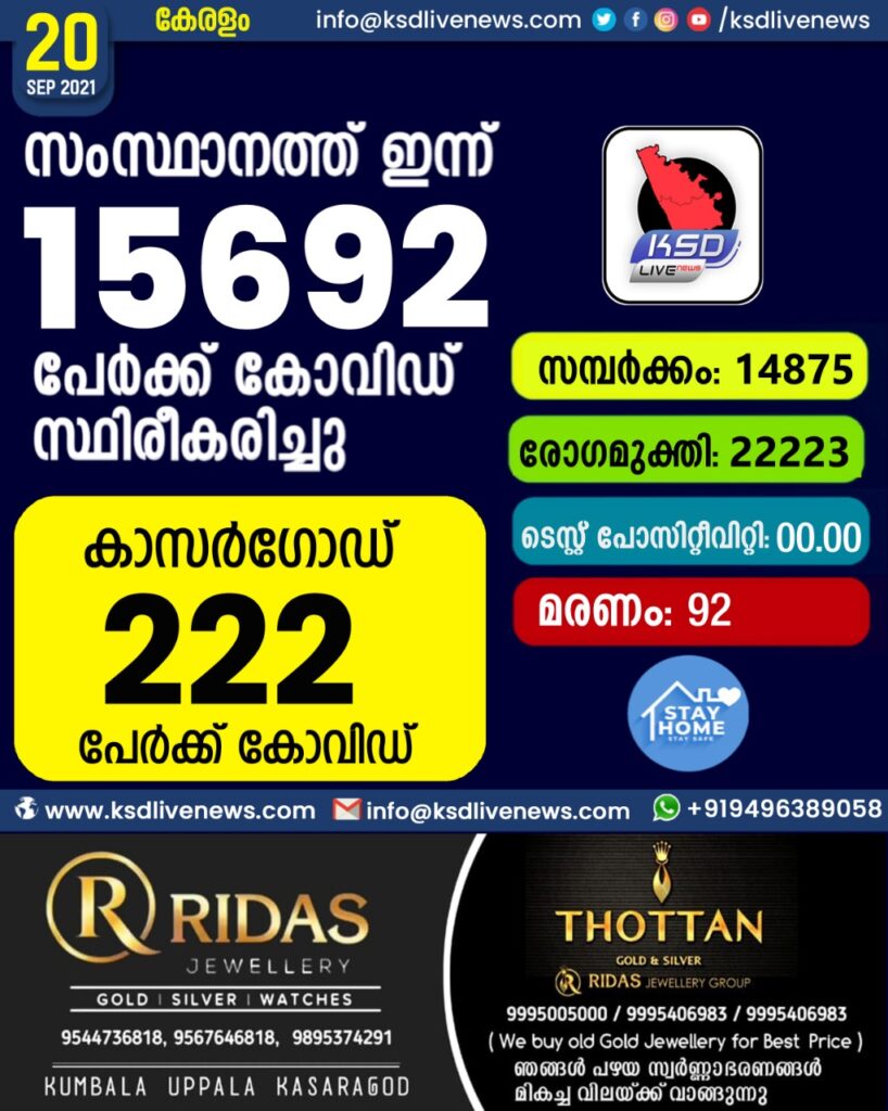 സംസ്ഥാനത്ത് ഇന്ന് 15,692 പേർക്ക് കോവിഡ് സ്ഥിരീകരിച്ചു. സമ്പർക്കം വഴി 14,875 പേർക്കും ; ആശ്വാസമായി 22,223 പേർക്ക് രോഗ മുക്തിയും ; കാസർഗോഡ് ജില്ലയിൽ 222 പേർക്ക് പുതിയ കോവിഡ് കേസുകൾ ; മരണം 92