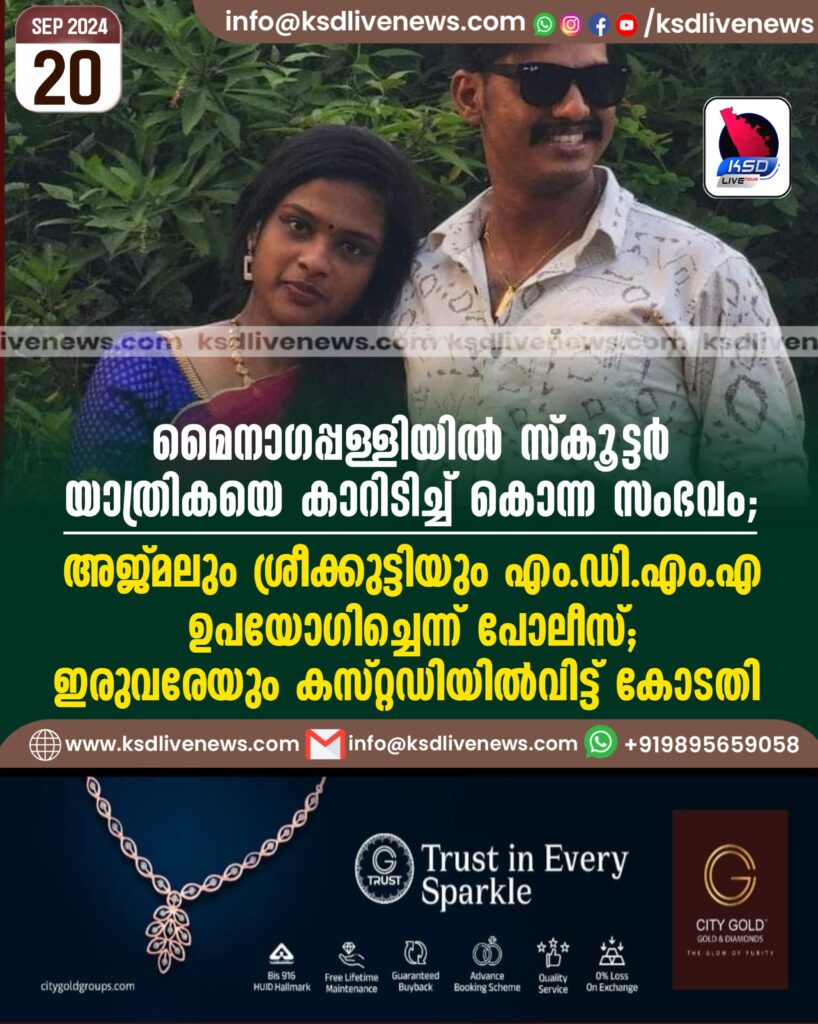 മൈനാഗപ്പള്ളിയിൽ സ്കൂട്ടർ യാത്രികയെ കാറിടിച്ച് കൊന്ന സംഭവം; അജ്മലും ശ്രീക്കുട്ടിയും എംഡിഎംഎ ഉപയോഗിച്ചെന്ന് പോലീസ്; ഇരുവരേയും കസ്റ്റഡിയിൽവിട്ട് കോടതി