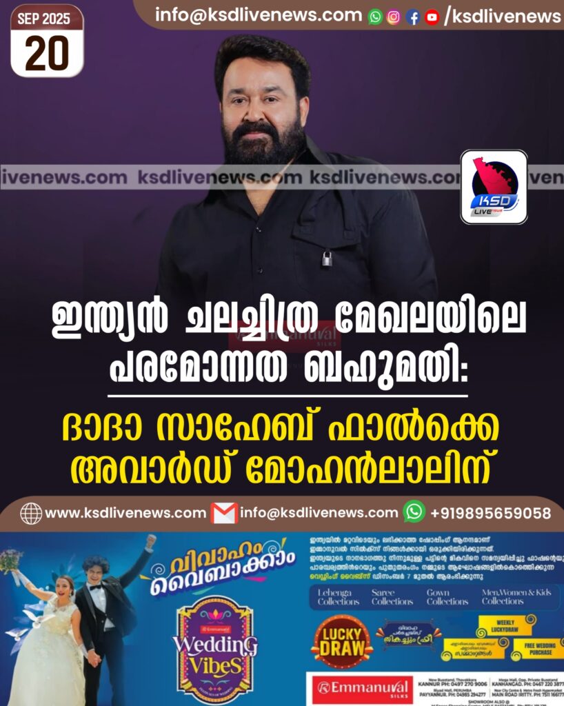 2023 ലെ ദാദാ സാഹിബ് ഫാല്ക്കെ അവാർഡ് മോഹൻ ലാലിന്. ചലച്ചിത്ര മേഖലയിലെ സമഗ്ര സംഭാവനയ്ക്കാണ് പുരസ്കാരം. ‘മോഹൻലാലിൻ്റെ സിനിമാ യാത്രാ തലമുറകളെ പ്രചോദനമേകുന്നത്’ ആണെന്ന വിലയിരുത്തലിന് പിന്നാലെയാണ് അവാർഡ് പ്രഖ്യാപിച്ചത്.