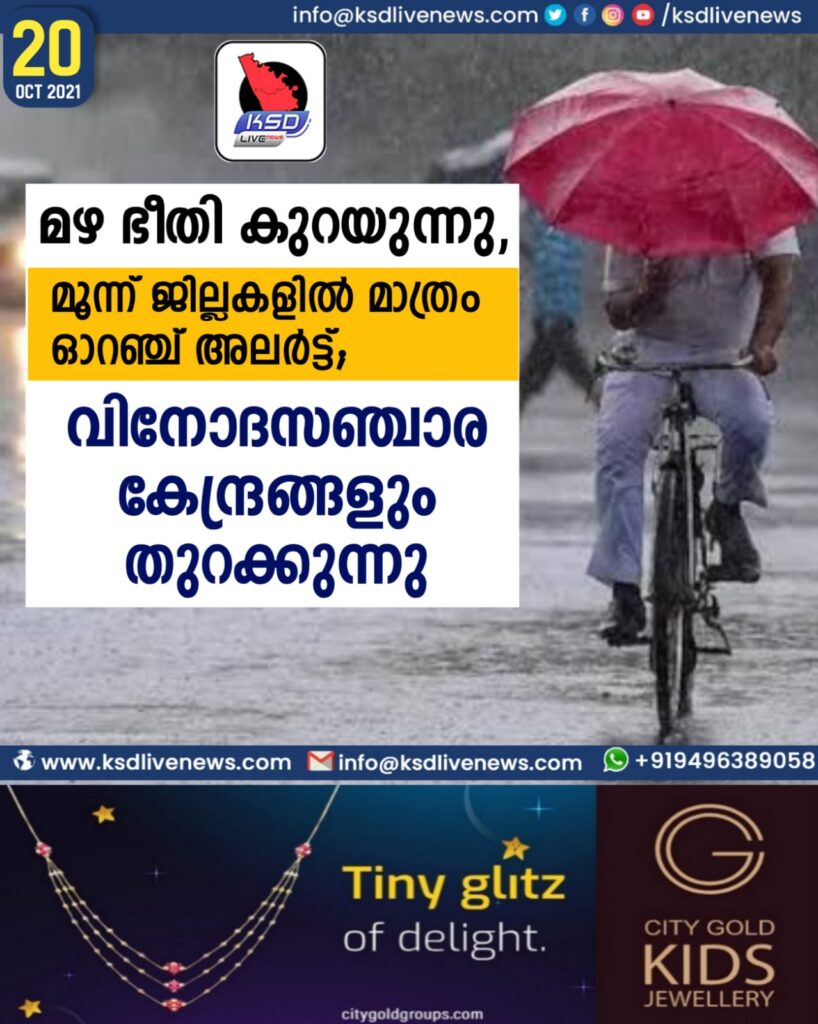 മഴ ഭീതി കുറയുന്നു, മൂന്ന് ജില്ലകളിൽ മാത്രം ഓറഞ്ച് അലർട്ട്; വിനോദസഞ്ചാര കേന്ദ്രങ്ങളും തുറക്കുന്നു