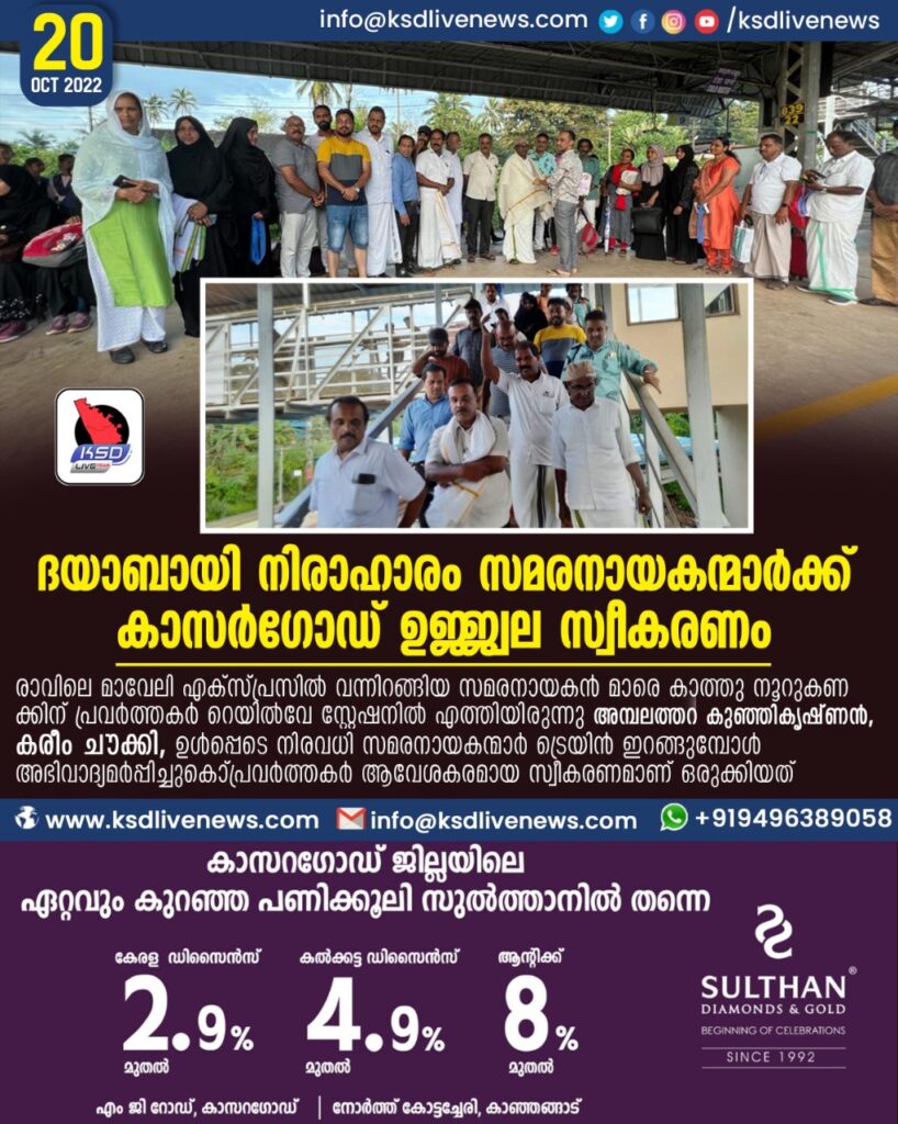രാവിലെ മാവേലി എക്സ്പ്രസിൽ വന്നിറങ്ങിയ സമരനായകൻ മാരെ കാത്തു നൂറുകണക്കിന് പ്രവർത്തകർ റെയിൽവേ സ്റ്റേഷനിൽ എത്തിയിരുന്നു