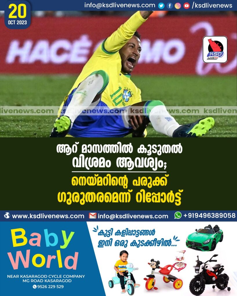 “ഫുട്‌ബോൾ താരം നെയ്മറിന്റെ പരുക്ക് ഗുരുതരമെന്ന് മെഡിക്കൽ റിപ്പോർട്ട്. 6 മാസത്തിൽ കൂടുതൽ വിശ്രമം ആവശ്യമാണെന്നാണ് റിപ്പോർട്ട് വ്യക്തമാക്കുന്നത്. ലോകകപ്പ് യോഗ്യതാ റൗണ്ടിൽ കഴിഞ്ഞ ദിവസം ഉറുഗ്വെക്കെതിരായ മത്സരത്തിലാണ് നെയ്മറിന് ഗുരുതരമായി പരുക്കേറ്റത്. നെയ്മറിന്റെ ഇടത് കാൽമുട്ടിനു പൊട്ടലുണ്ട്. അടുത്ത ദിവസം ശസ്ത്രക്രിയക്ക് വിധേയനാകും. 6 മാസത്തിൽ കൂടുതൽ താരത്തിനു കളിക്കളത്തിൽ നിന്നും വിട്ടു നിൽക്കേണ്ടി വരുമെന്നാണ് റിപ്പോർട്ട്. ഇന്ത്യയിൽ മുംബെ സിറ്റിക്കെതിരായ അൽഹിലാലിന്റെ മത്സരത്തിൽ നെയ്മർ ഉണ്ടാകില്ല. അൽഹിലാൽ ക്ലബ്ബിന്റെ ഈ സീസണും ബ്രസീലിൻറെ ലോകകപ്പ് യോഗ്യതാ റൌണ്ട് മത്സരങ്ങളിൽ പലതും നെയ്മറിന് കളിക്കാനാകില്ല. ലോകകപ്പ് യോഗ്യതാ റൗണ്ടിൽ ബ്രസീലിന്റെ അടുത്ത മത്സരങ്ങളും നെയ്‍മറിന് കളിക്കാനാകില്ല. കോപ്പ അമേരിക്കയ്ക്ക് മുമ്പ് പരുക്ക് ഭേദമാകുമെന്നാണ് പ്രതീക്ഷയെന്ന് ബ്രസീൽ ഫൂട്ബാൾ കോൺഫെഡറേഷൻ അറിയിച്ചു. പരുക്ക് മാനസികമായി ഏറെ വേദനിപ്പിക്കുന്നു എന്നും തന്റെ ജീവിതത്തിലെ മോശം സമയമാണ് ഇതെന്നും നെയ്മർ ഇക്കാര്യത്തിൽ പ്രതികരിച്ചു