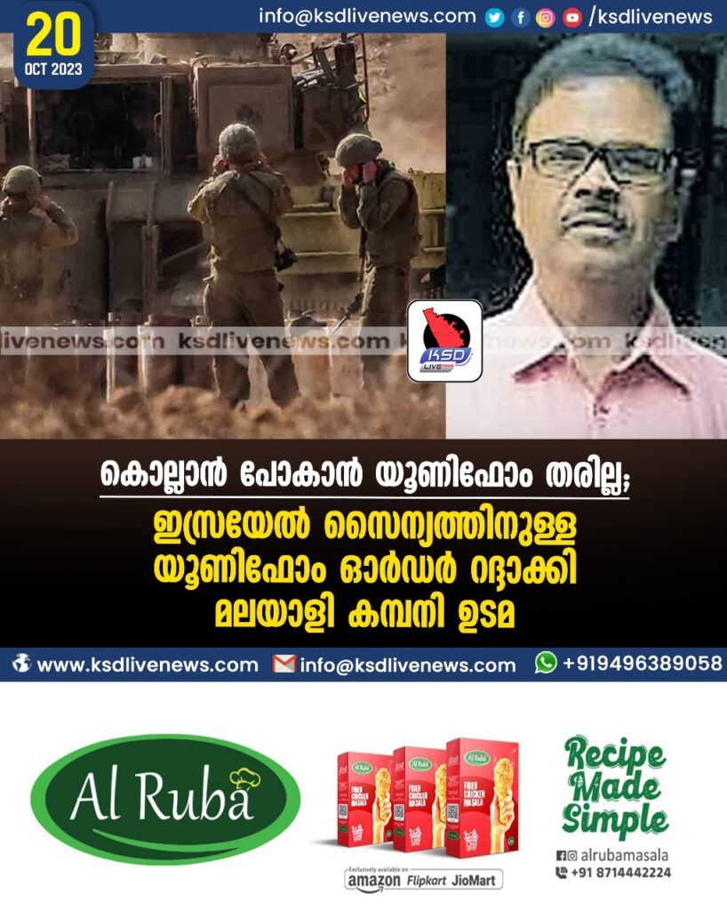 കൊല്ലാൻ പോകാൻ യൂണിഫോം തരില്ല’; ഇസ്രയേൽ സൈന്യത്തിനുള്ള യൂണിഫോം ഓർഡർ റദ്ദാക്കി മലയാളി കമ്പനി ഉടമ