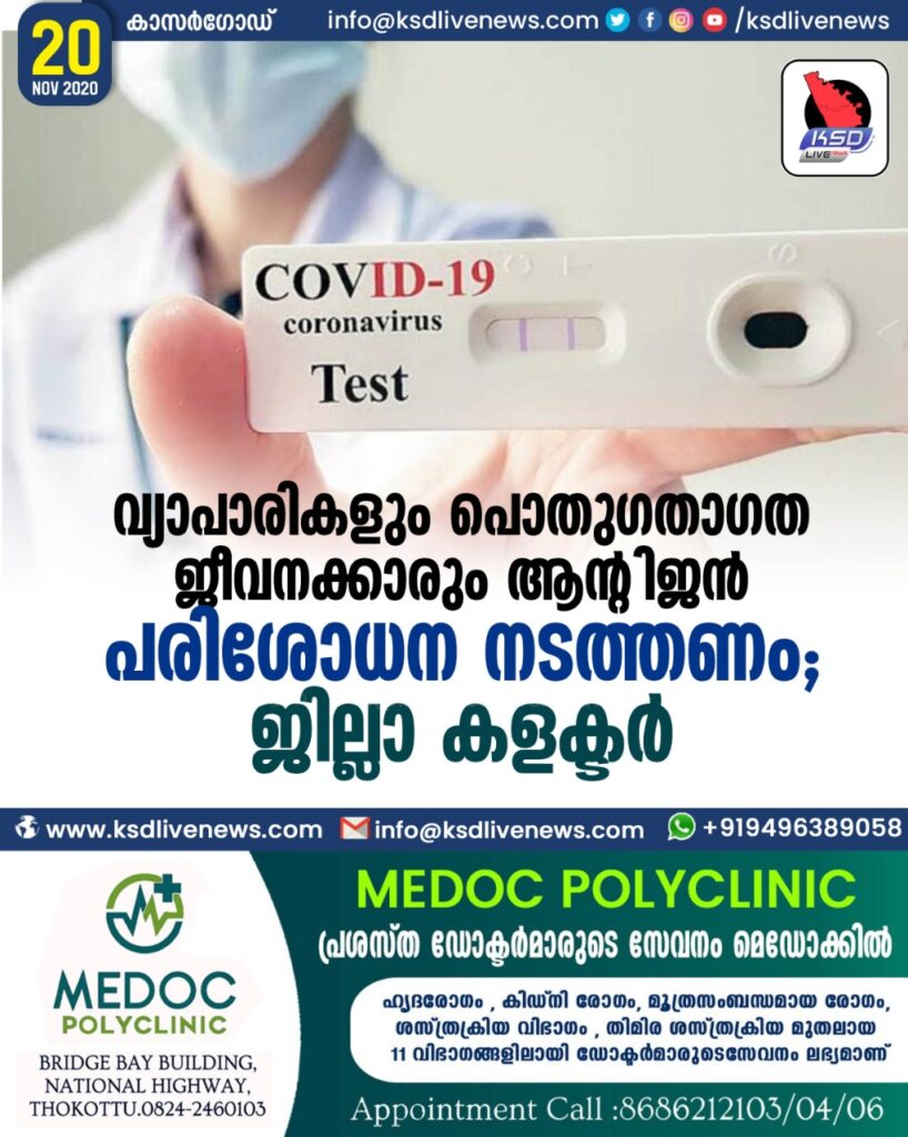 വ്യാപാരികളും പൊതുഗതാഗത ജീവനക്കാരും ആന്റിജൻ പരിശോധന നടത്തണം ; ജില്ലാ കളക്ടർ