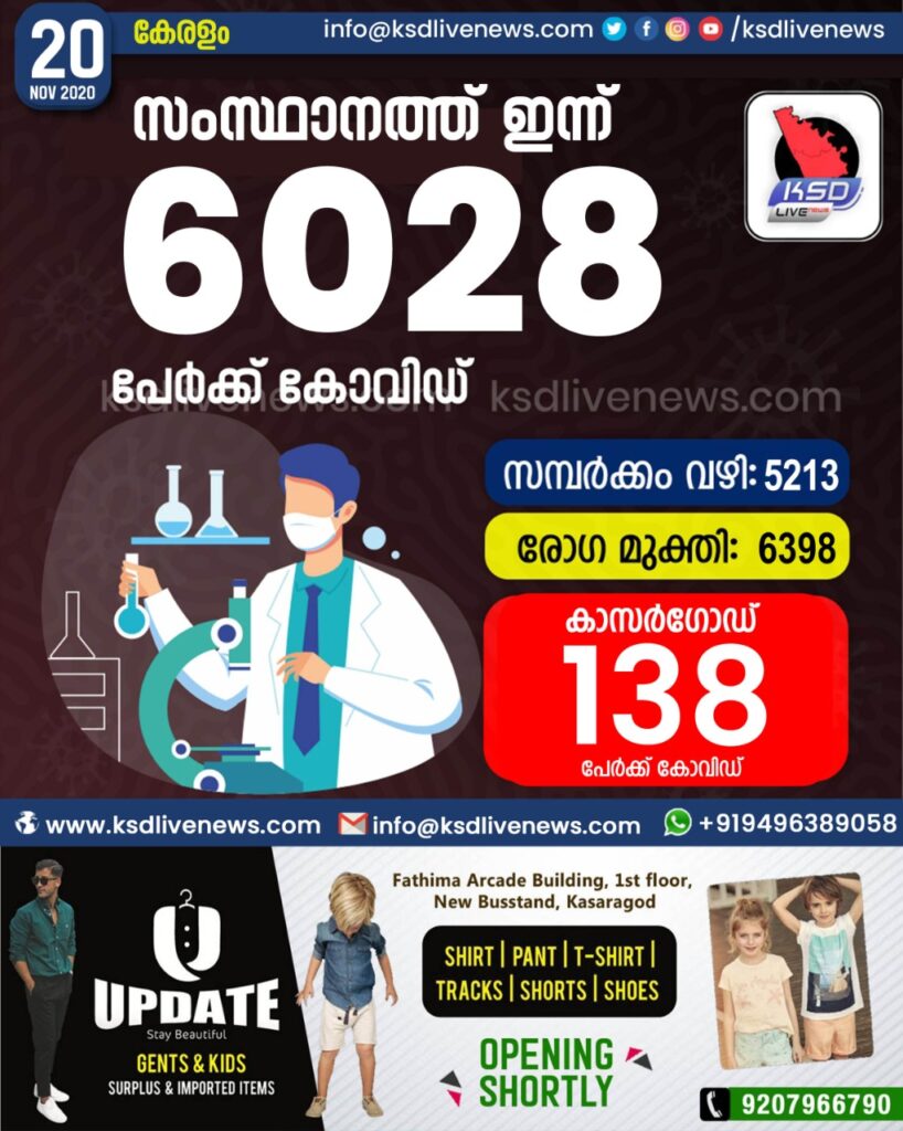 സംസ്ഥാനത്ത് ഇന്ന് 6028 പേർക്ക് കോവിഡ് സ്ഥിരീകരിച്ചു. സമ്പർക്കം വഴി 5213 പേർക്കും ; ആശ്വാസമായി 6398 പേർക്ക് രോഗ മുക്തിയും ; കാസർഗോഡ് ജില്ലയിൽ 138 പേർക്ക് പുതിയ കോവിഡ് കേസുകൾ ; മരണം 28