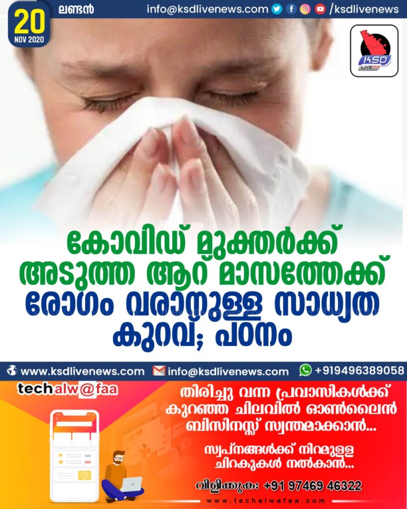 കോവിഡ് മുക്തർക്ക് അടുത്ത ആറ് മാസത്തേക്ക് രോഗം വരാനുള്ള സാധ്യത കുറവ് ; പഠനം