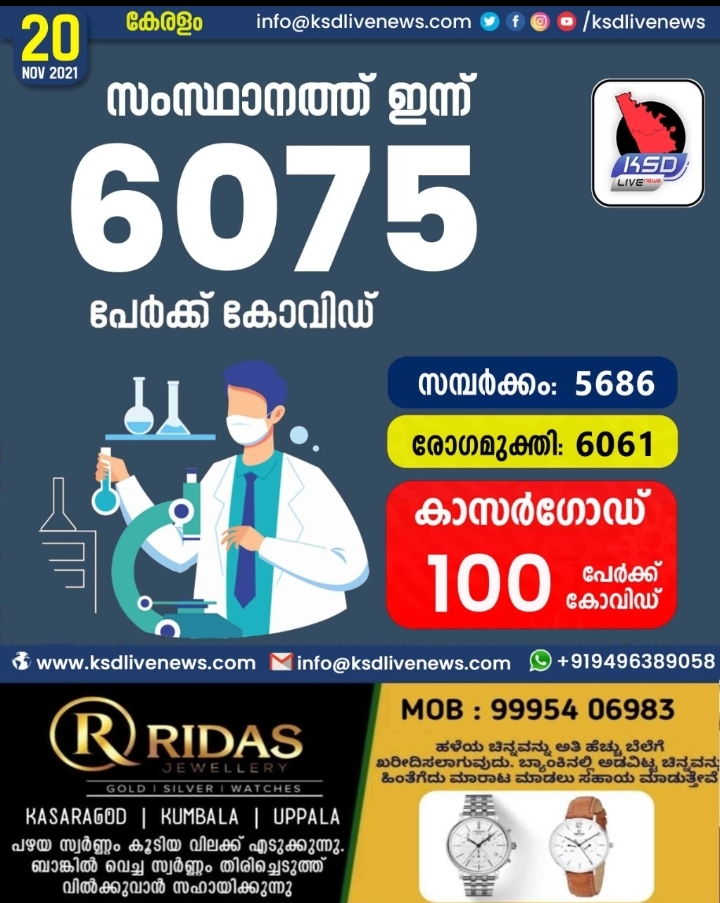 സംസ്ഥാനത്ത് ഇന്ന് 6075 പേർക്ക് കോവിഡ് സ്ഥിരീകരിച്ചു. സമ്പർക്കം വഴി 5886 പേർക്കും ; ആശ്വാസമായി 6061 പേർക്ക് രോഗ മുക്തിയും ; കാസർഗോഡ് ജില്ലയിൽ 100 പേർക്ക് പുതിയ കോവിഡ് കേസുകൾ ; മരണം 32