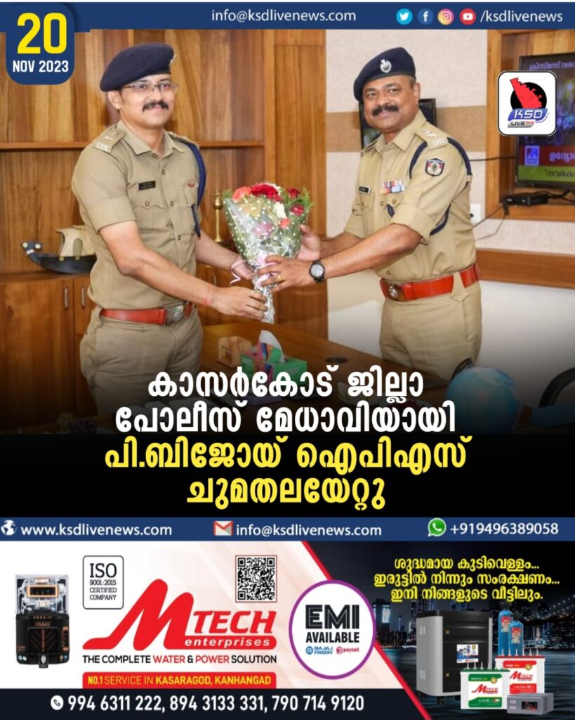 കാസർകോട് ജില്ലാ പോലീസ് മേധാവിയായി പി.ബിജോയ് ഐപിഎസ് ചുമതലയേറ്റുSHARE THIS ONകാസർകോട്: കാസർകോട് ജില്ലാ പോലീസ് മേധാവിയായി പി.ബിജോയ് ഐപിഎസ് ചുമതലയേറ്റു. സ്ഥാനം ഒഴിഞ്ഞ ഡോ. വൈഭവ് സക്സേന ഐപിഎസ് എറണാകുളം റൂറല് എസ്പിയായി ചുമതലയേല്ക്കും.