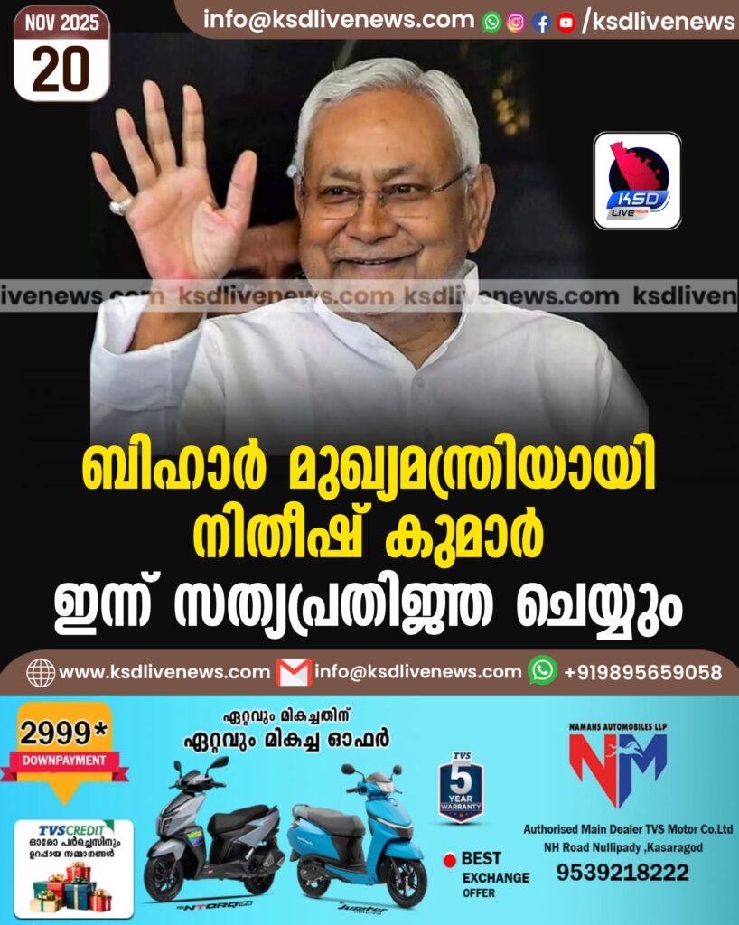 ബിഹാർ മുഖ്യമന്ത്രിയായി നിതീഷ് കുമാർ ഇന്ന് സത്യപ്രതിജ്ഞ ചെയ്യും
