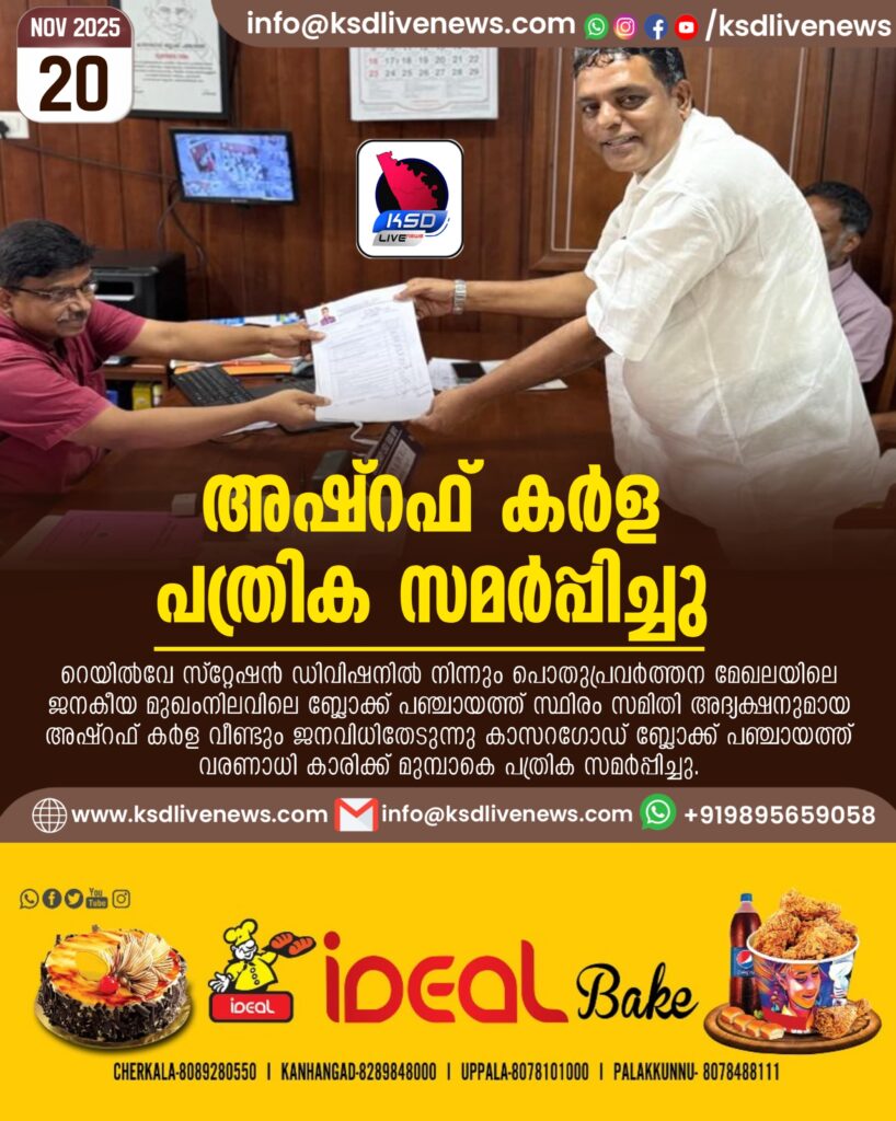 കാസറഗോഡ്: കാസർകോട് ബ്ലോക്ക് പഞ്ചായത്ത് കുമ്പള റെയിൽവേ സ്റ്റേഷൻ ഡിവിഷനിൽ നിന്നും പൊതുപ്രവർത്തന മേഖലയിലെ ജനകീയ മുഖംനിലവിലെ ബ്ലോക്ക് പഞ്ചായത്ത് സ്ഥിരം സമിതി അദ്യക്ഷനുമായ അഷ്റഫ്കർള വീണ്ടും ജനവിധിതേടുന്നു കാസറഗോഡ് ബ്ലോക്ക് പഞ്ചായത്ത് വരണാധി കാരിക്ക് മുമ്പാകെ പത്രിക സമർപ്പിച്ചു യു ഡി എഫ് നേതാക്കളും സുഹൃത്തു കളുമായ കല്ല ട്ര അബ്ദുൽ കാദർ ഹാജി. സി വി ജെയിംസ്. ബദർ അൽ മുനീർ സകീന അബ്ദുള്ള ഹാജി ഇബ്രാഹിം ബത്തേരി. സത്താർ ആരിക്കാടി കാദർ ആരിക്കാടി. ബി എം കെ സിദ്ദിഖ്. അൻവർ സിറ്റി മൊയ്ദീൻ അസീസ് കെ എം. റഫീഖ് ഐ എം ആർ എന്നിവർ സംബന്ധിച്ച്