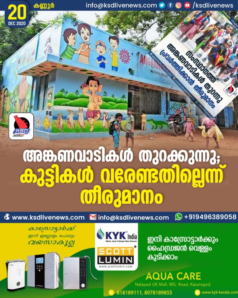കണ്ണൂർ:കോവിഡിനെത്തുടർന്ന് പൂട്ടിയ സംസ്ഥാനത്തെ 33,000-ഒാളം അങ്കണവാടികൾ തുറക്കാൻ തീരുമാനം. ഡിസംബർ 21 മുതൽ പ്രവർത്തനം പുനരാരംഭിക്കും. കുട്ടികൾ വരേണ്ടതില്ലെങ്കിലും ടീച്ചർമാരും ഹെൽപ്പർമാരും ഉൾപ്പെടെ 70,000-ഒാളം ജീവനക്കാർ എത്തണം.