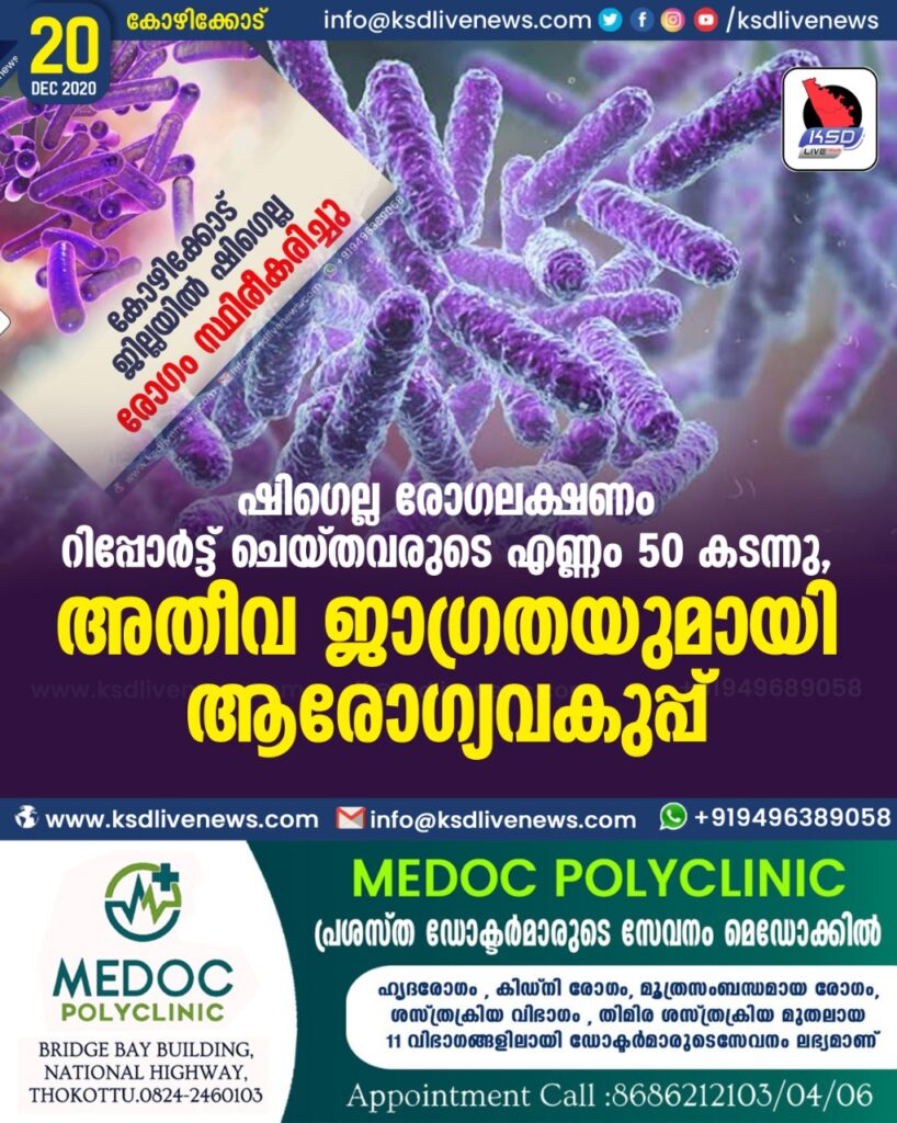 ഷിഗെല്ല രോഗലക്ഷണം റിപ്പോർട്ട് ചെയ്തവരുടെ എണ്ണം 50 കടന്നു , അതീവ ജാഗ്രതയുമായി ആരോഗ്യവകുപ്പ്