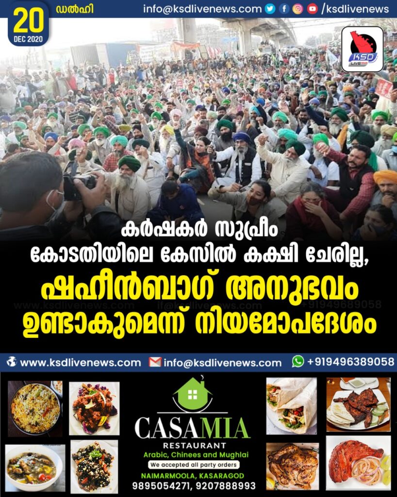 കർഷകർ സുപ്രീം കോടതിയിലെ കേസിൽ കക്ഷി ചേരില്ല , ഷഹീൻബാഗ് അനുഭവം ഉണ്ടാകുമെന്ന് നിയമോപദേശം