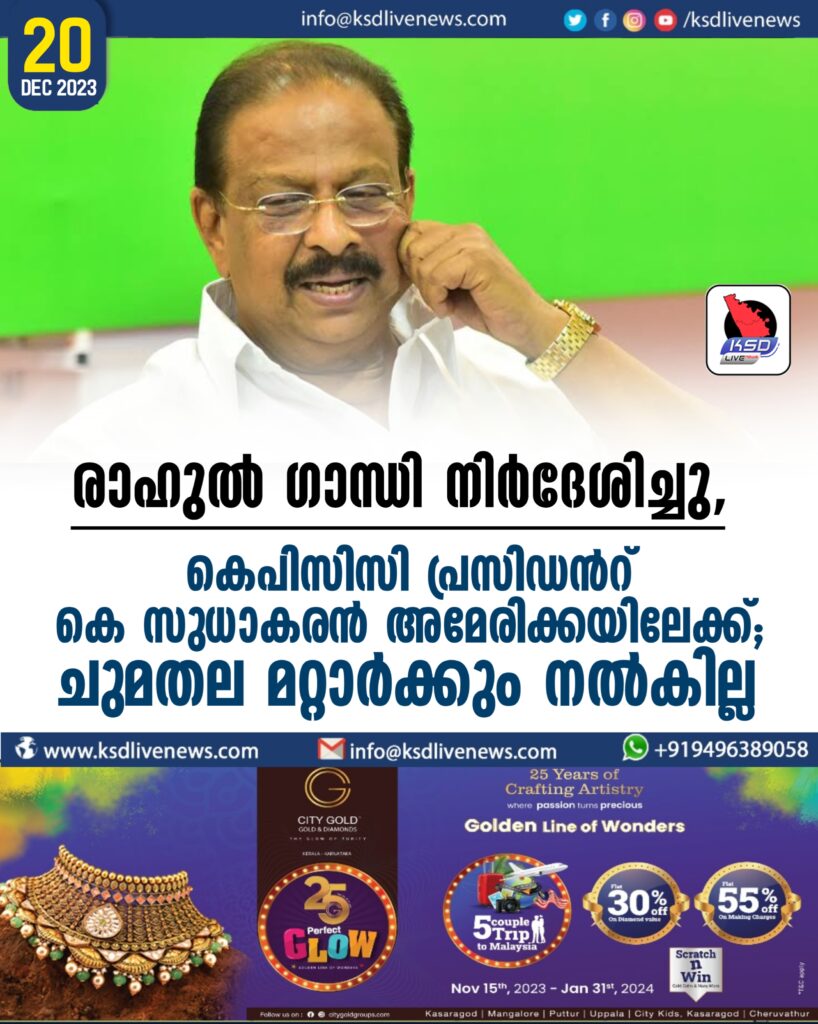 രാഹുൽ ഗാന്ധി നിർദേശിച്ചു, കെപിസിസി പ്രസിഡന്റ് കെ സുധാകരന് അമേരിക്കയിലേക്ക്; ചുമതല മറ്റാർക്കും നൽകില്ല