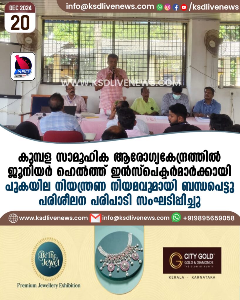 കുമ്പള സാമൂഹിക ആരോഗ്യകേന്ദ്രത്തിൽ ജൂനിയർ ഹെൽത്ത്‌ ഇൻസ്പെക്ടർ മാർക്കായി പുകയില നിയന്ത്രണ നിയമവു മായി ബന്ധപെട്ടു പരിശീലന പരിപാടി സംഘടിപ്പിച്ചു