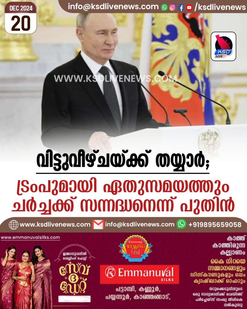 മോസ്‌കോ: നിയുക്ത യു.എസ്. പ്രസിഡന്റ് ഡൊണാള്‍ഡ് ട്രംപുമായി ഏതുസമയത്തും ചര്‍ച്ചനടത്താന്‍ തയ്യാറാണെന്ന് റഷ്യന്‍ പ്രസിഡന്റ് വ്‌ലാദിമിര്‍ പുതിന്‍. ട്രംപുമായുള്ള ചര്‍ച്ചയില്‍ യുക്രൈന്‍ യുദ്ധത്തില്‍ വിട്ടുവീഴ്ചയ്ക്ക് തയ്യാറാണ്. ചര്‍ച്ചകള്‍ക്ക് മുന്‍വ്യവസ്ഥകളൊന്നുമില്ലെന്നും എന്നാല്‍ ഏത് കരാറിലും നിയമാനുസൃതമായി യുക്രൈന്‍ ഭരണകൂടവും ഉള്‍പ്പെടുമെന്നും പുതിന്‍ പറഞ്ഞു. ജനുവരിയില്‍ ട്രംപ് അധികാരമേല്‍ക്കാനിരിക്കെയാണ് വാര്‍ഷിക വാര്‍ത്താസമ്മേളനത്തില്‍ പുതിന്റെ പ്രസ്താവന.