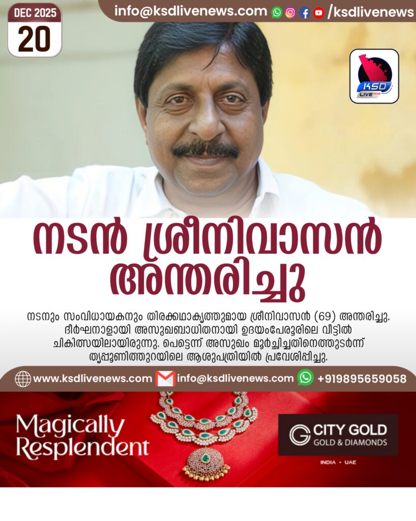 കൊച്ചി: നടനും സംവിധായകനും തിരക്കഥാകൃത്തുമായ ശ്രീനിവാസൻ (69) അന്തരിച്ചു. ദീർഘനാളായി അസുഖബാധിതനായി ഉദയംപേരൂരിലെ വീട്ടിൽ ചികിത്സയിലായിരുന്നു. പെട്ടെന്ന് അസുഖം മൂർച്ഛിച്ചതിനെത്തുടർന്ന് തൃപ്പൂണിത്തുറയിലെ ആശുപത്രിയിൽ പ്രവേശിപ്പിച്ചു. ശനിയാഴ്ച രാവിലെയോടെയാണ് മരണം സ്ഥിരീകരിച്ചത്.