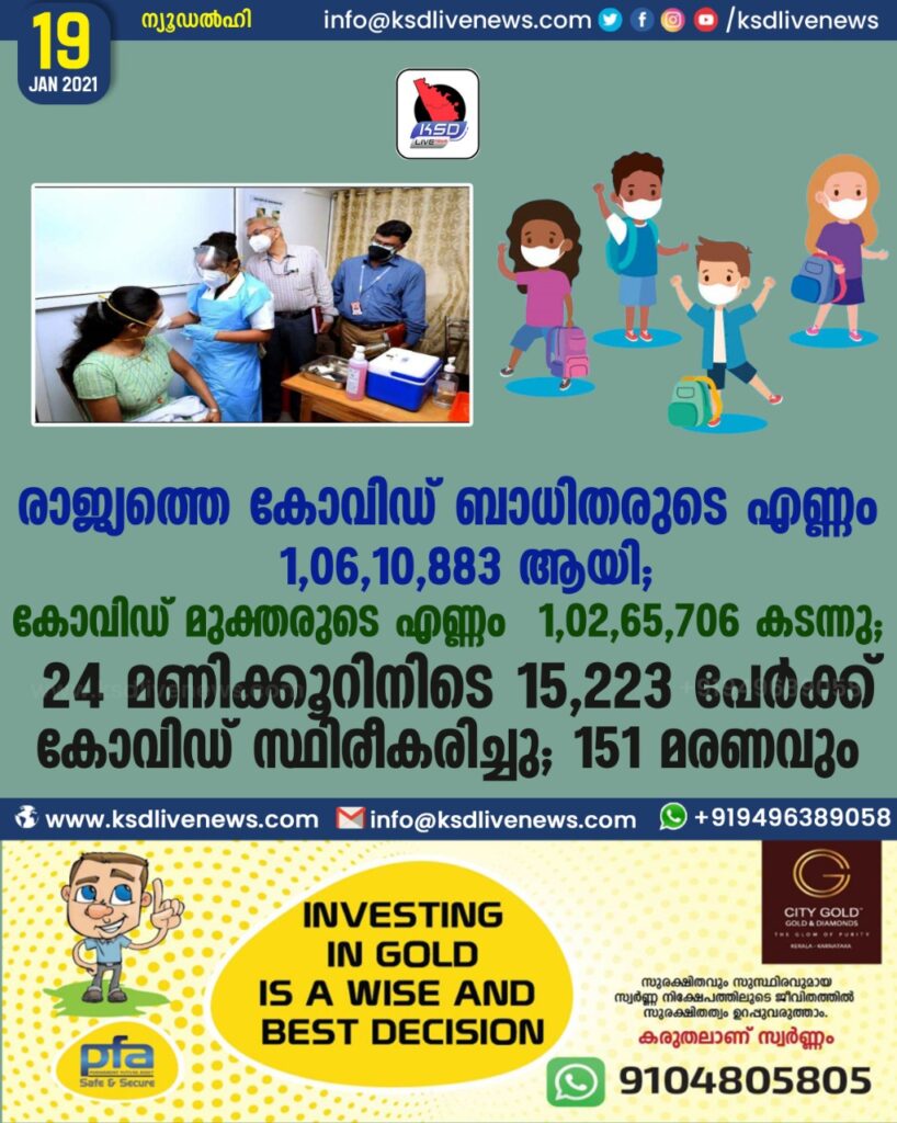രാജ്യത്തെ കോവിഡ് ബാധിതരുടെ എണ്ണം 1,06,10,883 ; കോവിഡ് മുക്തരുടെ എണ്ണം 1,02,65,706 ലക്ഷവും ;