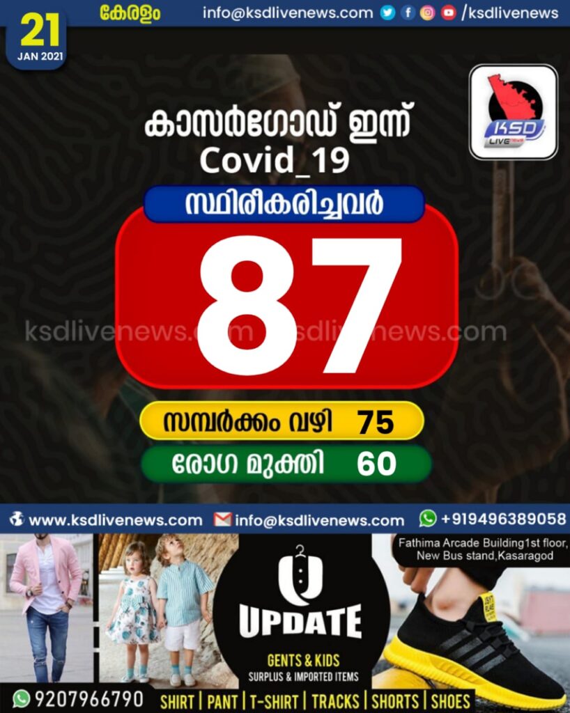 കാസർഗോഡ് ജില്ലയിൽ ഇന്ന് 87 പേർക്ക് കോവിഡ് സ്ഥിരീകരിച്ചു. സമ്പർക്കം വഴി 75 പേർക്കും. 60 പേർക്ക് രോഗമുക്തി