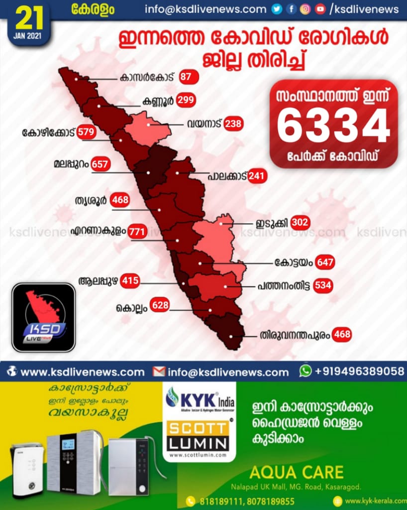 സംസ്ഥാനത്ത് ഇന്ന് 6334 പേര്‍ക്ക് കോവിഡ്-19 സ്ഥിരീകരിച്ചു. എറണാകുളം 771, മലപ്പുറം 657, കോട്ടയം 647, കൊല്ലം 628, കോഴിക്കോട് 579, പത്തനംതിട്ട 534, തിരുവനന്തപുരം 468, തൃശൂര്‍ 468, ആലപ്പുഴ 415, ഇടുക്കി 302, കണ്ണൂര്‍ 299, പാലക്കാട് 241, വയനാട് 238, കാസര്‍ഗോഡ് 87 എന്നിങ്ങനേയാണ് ജില്ലകളില്‍ ഇന്ന് രോഗ ബാധ സ്ഥിരീകരിച്ചത്.