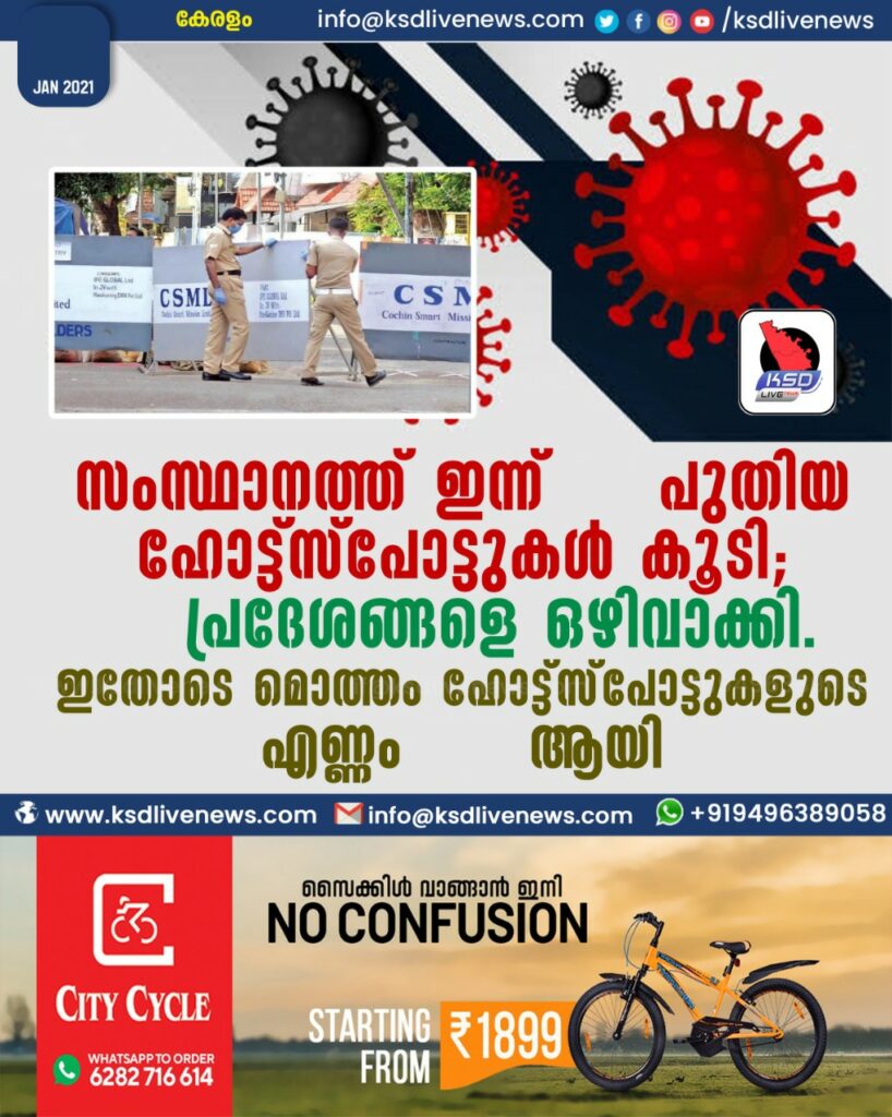 സംസ്ഥാനത്ത് ഇന്ന് 03 പുതിയ ഹോട്ട്സ്പോട്ടുകള് കൂടി; 02 പ്രദേശങ്ങളെ ഒഴിവാക്കി. ഇതോടെ മൊത്തം ഹോട്ട്സ്പോട്ടുകളുടെ എണ്ണം 406 ആയി.