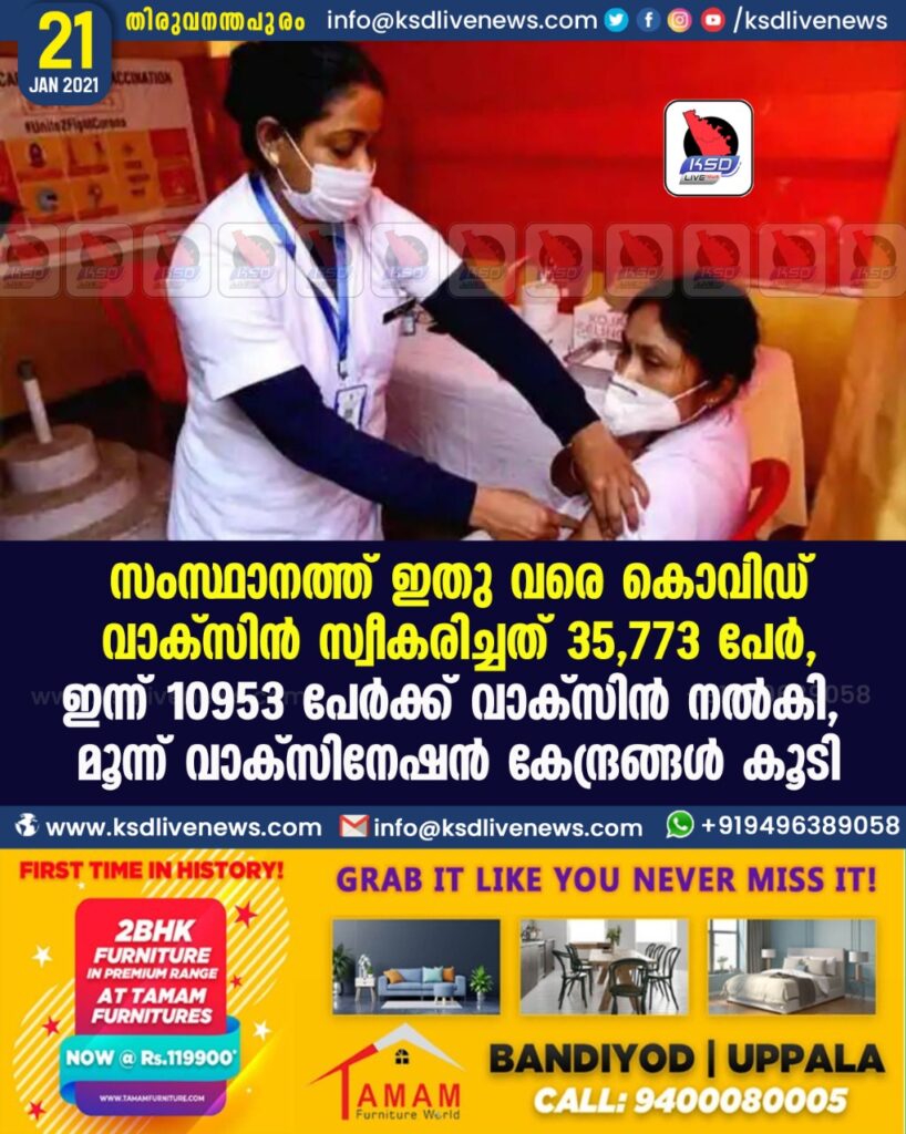 സംസ്ഥാനത്ത് ഇതു വരെ കൊവിഡ് വാക്സിൻ സ്വീകരിച്ചത് 35,773 പേർ , ഇന്ന് 10953 പേർക്ക് വാക്സിൻ നൽകി , മൂന്ന് വാക്സിനേഷൻ കേന്ദ്രങ്ങൾ കൂടി