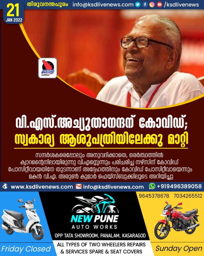 തിരുവനന്തപുരം: മുൻ മുഖ്യമന്ത്രി വി.എസ്.അച്യുതാനന്ദന് കോവിഡ് സ്ഥിരീകരിച്ചു. അദ്ദേഹത്തെ തിരുവനന്തപുരത്തെ സ്വകാര്യ ആശുപത്രിയിലേക്കു മാറ്റി. സന്ദർശകരെപ്പോലും അനുവദിക്കാതെ, ഒരർത്ഥത്തിൽ ക്വാറന്റൈനിലായിരുന്നു വി.എസ്സെന്നും പരിചരിച്ച നഴ്സിന് കോവിഡ് പോസിറ്റീവായതിനേ തുടന്നാണ് അദ്ദേഹത്തിനും കോവിഡ് പോസിറ്റീവായെന്നും മകൻ വി.എ. അരുൺ കുമാർ ഫെയ്സ്ബുക്കിലൂടെ അറിയിച്ചു.