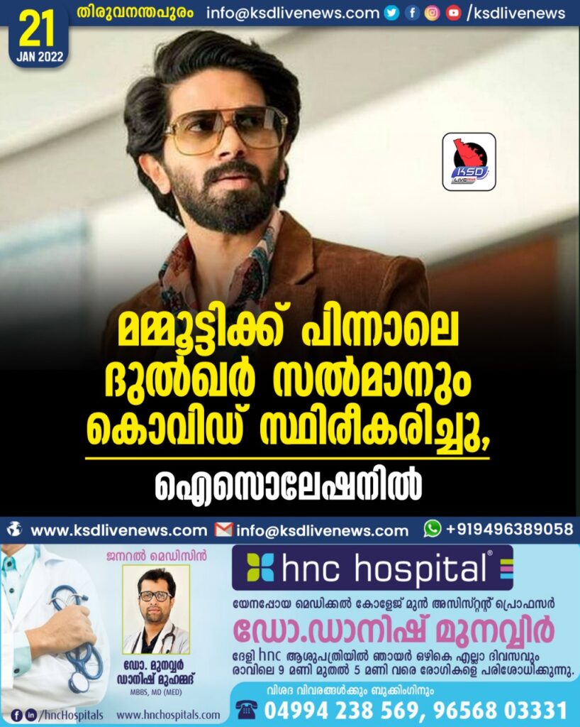മമ്മൂട്ടിക്ക് പിന്നാലെ ദുല്ഖര് സല്മാനും കൊവിഡ് സ്ഥിരീകരിച്ചു, ഐസൊലേഷനില്