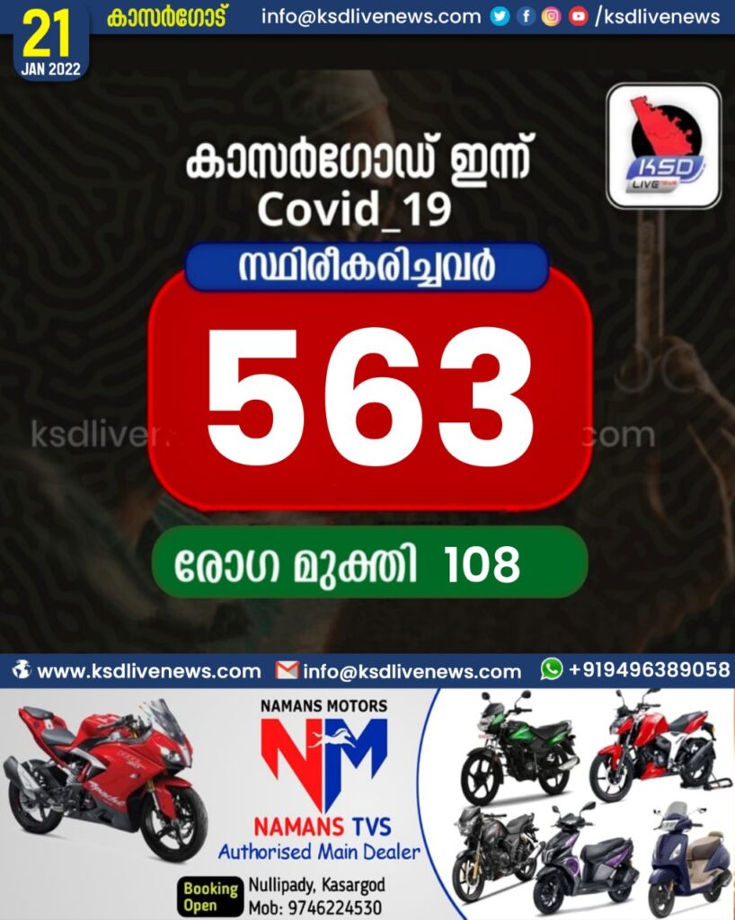 പിടിമുറുക്കി കോവിഡ് ; കാസർഗോഡ് ജില്ലയിൽ ഇന്ന് 563 പേർക്ക് കോവിഡ് സ്ഥിരീകരിച്ചു. 108 പേർക്ക് രോഗമുക്തിSHARE THIS ON