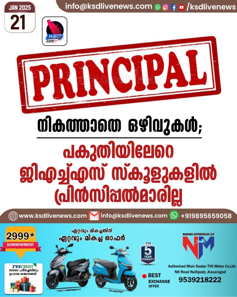 ജിഎച്ച്എസ്എസ് ചന്ദ്രഗിരി, ഉദുമ,ബന്തടുക്ക, ബേക്കൂർ, ബേക്കൽ, പൈവളിഗെ, മൊഗ്രാൽപുത്തൂർ, ആദൂർ, ബേത്തൂർപ്പാറ, ബങ്കര മഞ്ചേശ്വരം, പട്ട്‍ല, പടന്നക്കടപ്പുറം, കാസർകോട്, മംഗൽപാടി, ഉപ്പള, കമ്പല്ലൂർ, തളങ്കര, രാവണിശ്വേരം, പെരിയ, കല്ല്യോട്ട്, കുമ്പള, തായന്നൂർ, തൃക്കരിപ്പൂർ, പരപ്പ, കക്കാട്ട്, ഷിറിയ, കൊട്ടോടി, ഇരിയണ്ണി,എടനീർ തുടങ്ങിയ വിദ്യാലയങ്ങളിലാണ് പ്രിൻസിപ്പൽമാരില്ലാത്തത്.